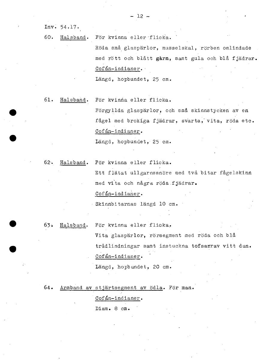 — 12 — Inv. 54.17. 60-. Halsband. För kvinna eller-flicka. Röda små. glaspärlor, musselskal, rörben omlindade med rött och blått gårn, samt gula och blå fjädrar. Cofån—indianer., Längd, hopbundet, 25 cm. 61. Halsband. För kvinna eller flicka. • Förgyllda glaspärlor, och små skinnstycken av en fågel med brokiga fjädrar, svarta, vita, röda etc. Cofån—indianer. • Längd, hopbundet,. 25 cm. 62:. Halsband. För kvinna eller flicka. Ett flätat ullgarnssnöre med två bitar fågelskinn med vi:ta och några röda.fjädrar. Cofån—indianer. Skinnbitarnas längd 10 cm. 63: Halsband. För kvinna eller fliaka, Vita glaspärlor, rörsegment med rbda och blå trådlindningar Samt instuckna tofsarrav vitt dun. • Cofån—indianer. Längd, hopbundet, 20 cm. 64. Armband av stjärtsegment av ödla. För man. Cofån—indianer. Diam. 8 cm. [ocr]