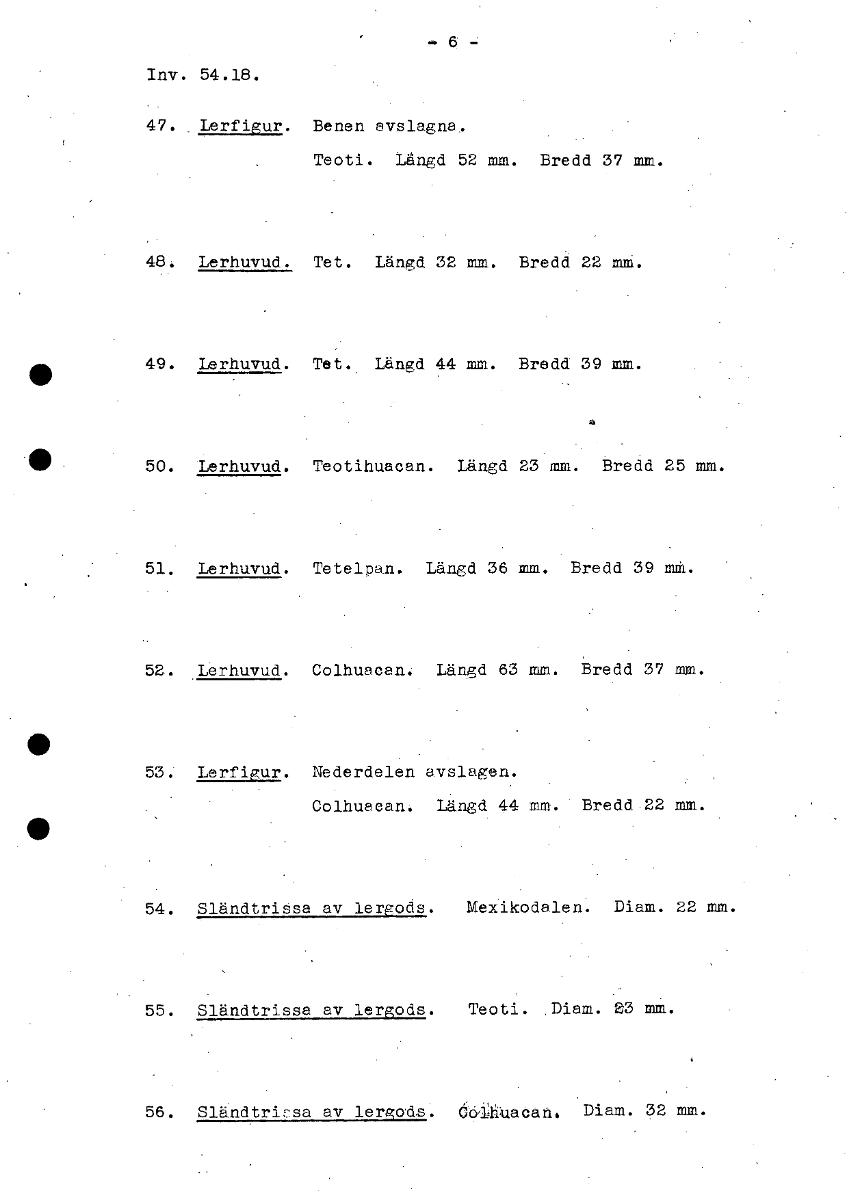 .6 Inv. 54.18. 47. Lerfigur. Benen avslagna. Teoti. Längd 52 mm. Bredd 37 mm. 48. Lerhuvud. Tet. Längd 32 mm. Bredd 22 49. Lerhuvud. Tet. Längd 44 mm. Bredd 39 mm. • 50. Lerhuvud. Teotihuacan. Längd 23 mm. Bredd 25 mm. 51. Lerhuvud. Tetelpan. Längd 36 mm. Bredd 39 mM. 52. Lerhuvud. Colhuacan. Längd 63 mm. Bredd 37 mm. 53. Lerfigur. Nederdelen avslagen. Colhuacan. Längd 44 mm. Bredd 22 mm. 54. Sländtrissa av lergods. Mexikodalen. Diam. 22 mm. 55. Sländtrissa av lergods. Teoti. Diam. 23 mm. 56. Sländtrisa av lergods. Colhuacan, Diam. 32 mm. [ocr]Stäng