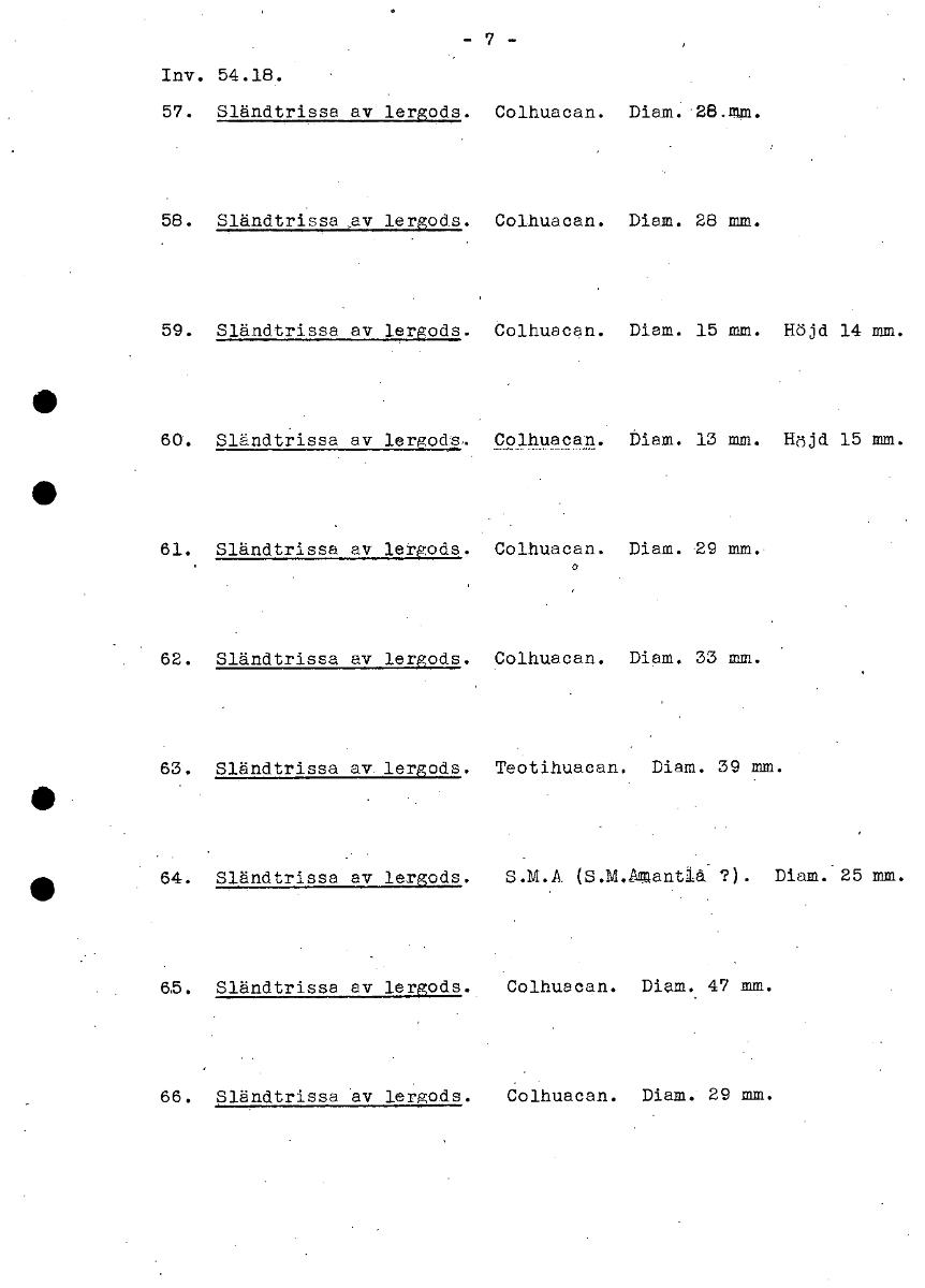 7 Inv. 54.18. Sländtrissa av lergods. Colhuacan. Diam. 28.mm. Sländtrissa,av lergods. Colhuacan. Diam. 28 mm. Sländtrissa av lergods. Colhuacan. Diam. 15 mm. Höjd 14 mm. Sländtrissa av lergods. Colhuacan. Diam. 13 mm. Höjd 15 mm. Sländtrissa av lergods. Colhuacan. Diam. 29 mm. 0 Sländtrissa av lergods. Colhuacan. Diam. 33 mm. Sländtrissa av lergods. Teotihuacan. Diam. 39 mm. Sländtrissa av lergods. S.M.A. (S.M.4Mantla?). Diam. 25 mm. Sländtrissa av lergods. Colhuacan. Diam. 47 mm. Sländtrissa av lergods. Colhuacan. Diam. 29 mm. [ocr]Stäng