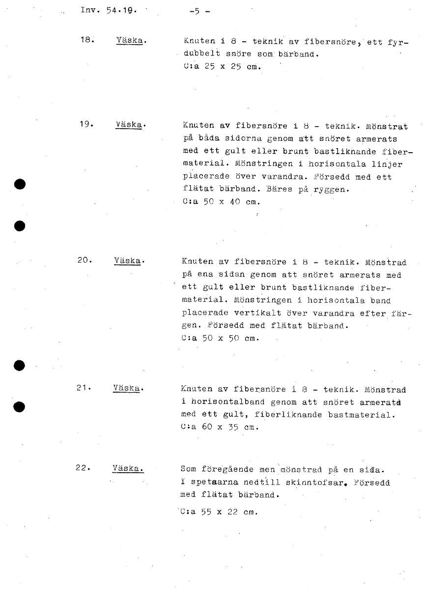 Inv. 54-19. -5 - 18. Väska. Knuten i 8 - teknik. av fibersnörey' ett fyr- . dubbelt snöre som:bärband. C:a 25 x 25 cm. 19. Väska. Knuten av fibersnöre i 8 - teknik. mönstrat på bäda sidorna genom ått ...Visa hela