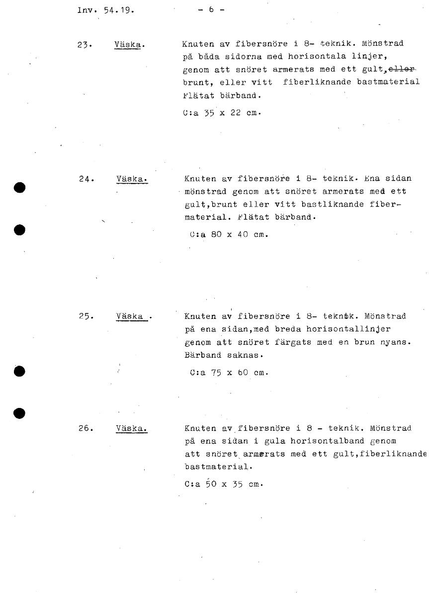 Inv. 54.19. - b 23. Väska. Knuten av fibersnöre i 8- teknik. Mönstrad på båda sidorna med horisontala linjer, genom att snöret armerats med ett gult,c1lor brunt, eller vitt fiberliknande bastmaterial Flätat bärband. C:a 35 x 22 cm. 24. Väska. Knuten av fibersnöre i 8- teknik. Ena sidan • mönstrad genom att snöret armerats med ett gult,brunt eller vitt bastliknande fiber- material. Flätat bärband. C:a 80 x 40 cm. 25. Väska . Knuten av fibersnöre i 8- teknik. Mönstrad på ena sidan,med breda horisontallinjer genom att snöret färgats med en brun nyans. Bärband saknas. C:a 75 x 60 cm. 26. Väska. Knuten av fibersnörei 8 - teknik. Mönstrad på ena sidan i gula horisontalband genom att snöret,armerats med ett gult,fiberliknande bastmaterial. C:a 50 x 35 cm. [ocr]