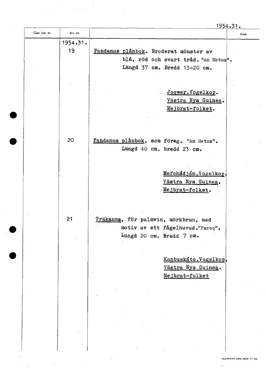 • 1954.31. 1954.31. 19 Pandanus plånbok. Broderat mönster av blå, röd och svart tråd. "Am Metus Längd 37 em. Bredd 13-20 cm. Jocivier.Vogelkop. Västra Nya Guinea: Mejbrat-folket. 20 Pandanus plånbok, so... Visa hela