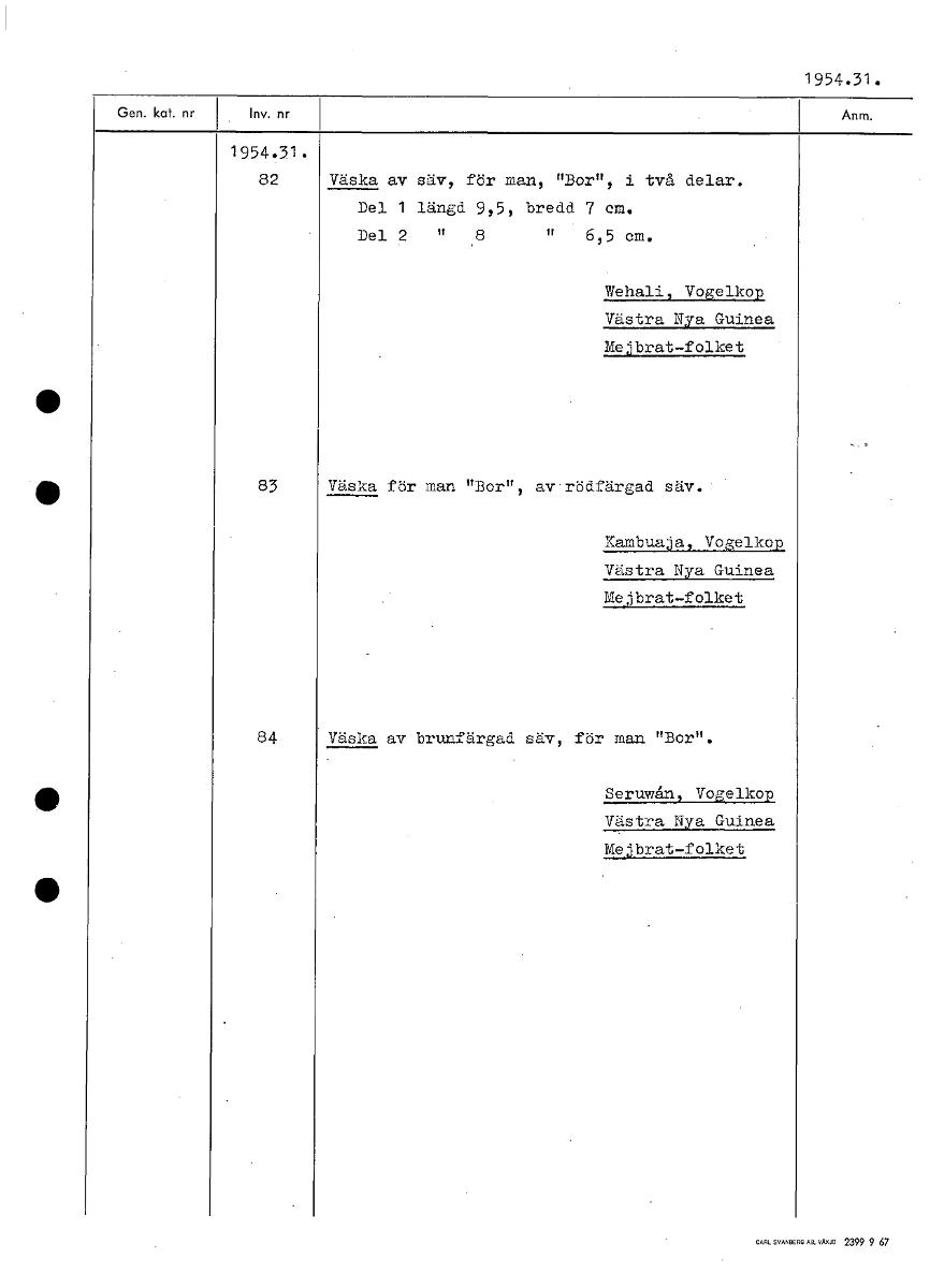 1954.31. 1954.31. 82 Väska av säv, för man, "Bor", i två delar. Del 1 längd 9,5, bredd 7 em. Del 2 8 6,5 cm. Wehali, Vogelkop Västra Nya Guinea Mejbrat-folket 3 Väska för man "Bor", av.rödfärgad säv. • ,Kambuaja, Vogelkop Västra Nya Guinea Mejbrat-folket 84 Väska av brunfärgad säv, för man "Bor". Seruwån, Vogelkop Västra Nya Guinea Mejbrat-folket [ocr]