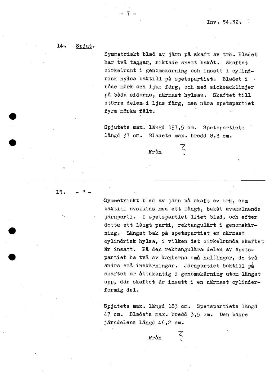 • Inv . 14,4 Spjut,. Symmetriskt blad av järn på skaft av trä. Bladet har två taggar, riktade snett bakåt. Skaftet cirkelrunt i genomskärning och insatt i cylind- risk hylsa baktill på spetspartiet. Bla... Visa hela