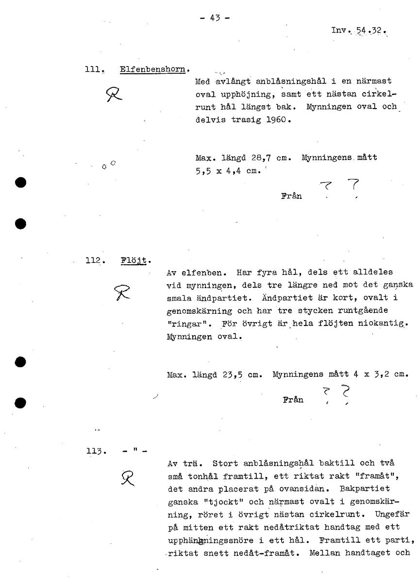 - 43 - Inv 54.32 111, Elfenbenshorn. Med avlångt anblåsningshål i en närmast oval upphöjning, samt ett nästan cirkel- runt hål längst bak. Mynningen oval och delvis trasig 1960. Max. längd 28,7 cm. My...
