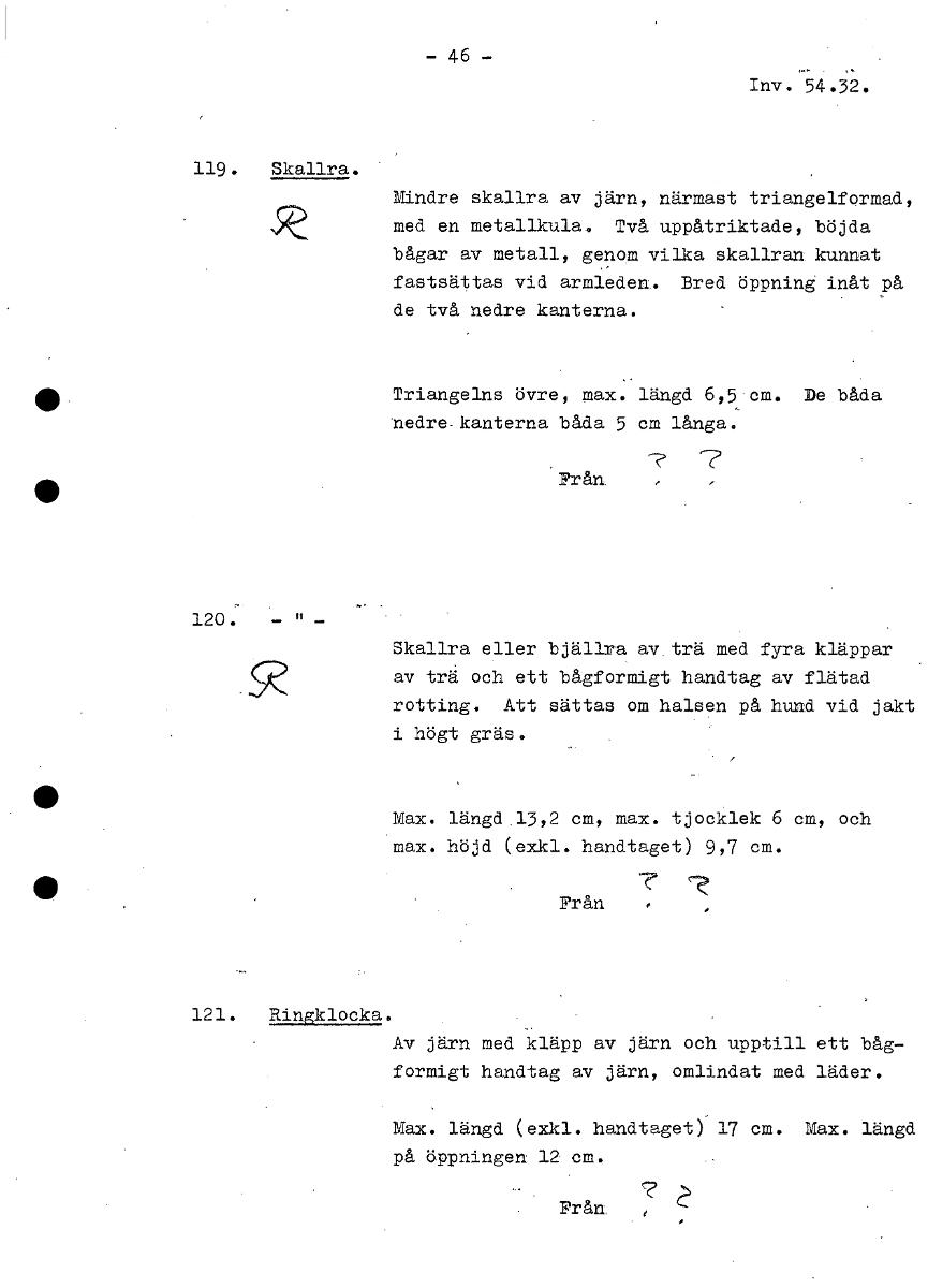 • -46- Inv. 54.32. 119. Skallra. Mindre skallra av järn, närmast triangelformad, med en metallkula. Två uppåtriktade, böjda bågar av metall, genom vilka skallran kunnat fastsättas vid armleden, Bred öpp... Visa hela