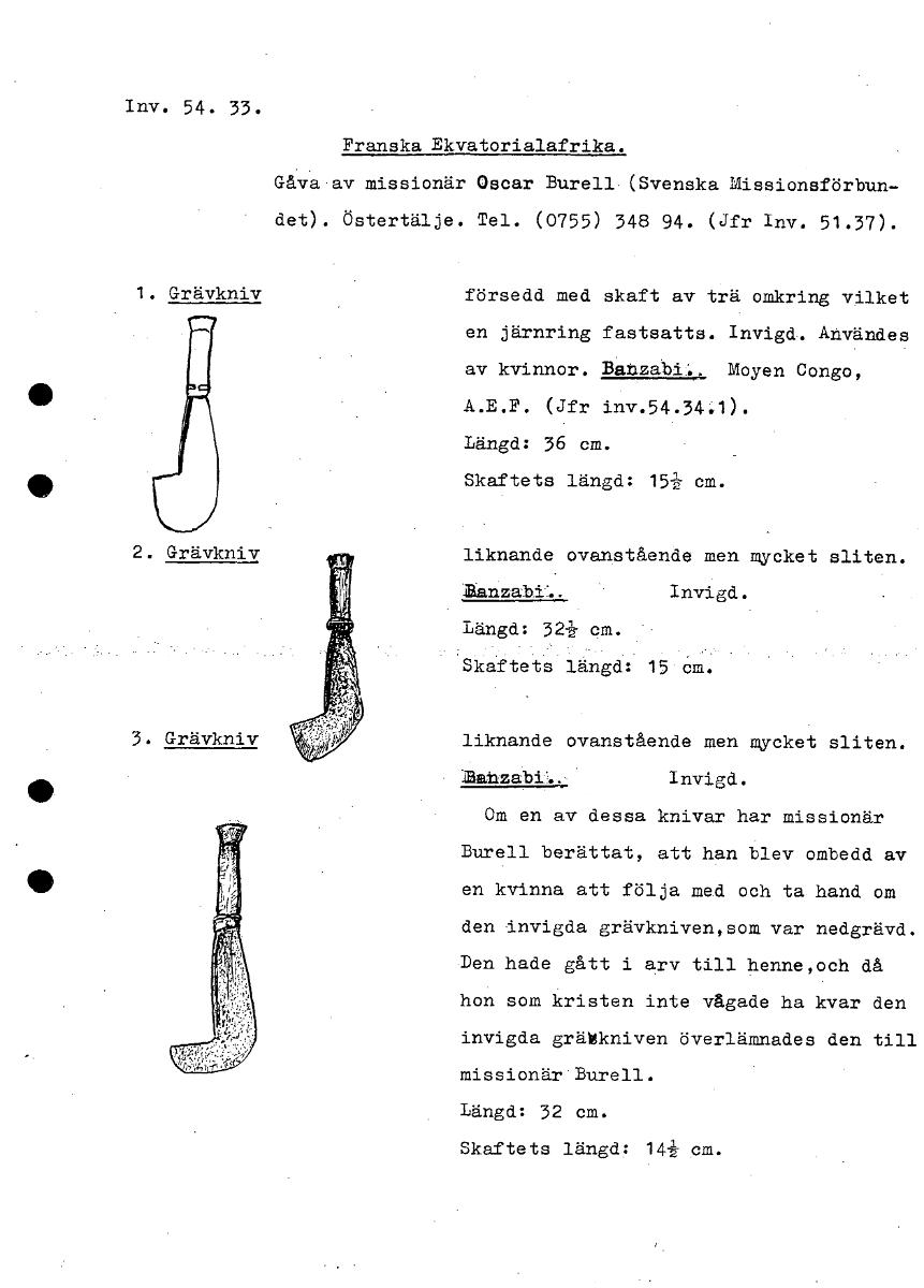 Inv. 54. 33. Franska Ekvatorialafrika. Gåva av missionär Oscar Burell (Svenska Missionsförbun- det). Östertälje. Tel. (0755) 348 94. (Jfr Inv. 51.37). 1. Grävkniv försedd med skaft av trä omkring vilket en järnring fastsatts. Invigd. Användes av kvinnor. Batzabi., Moyen Congo, A.E.F. (Jfr inv.54.34.1). Längd: 36 cm. Skaftets längd: 15i cm. 2. Grävkniv liknande ovanstående men mycket sliten. Invigd. Längd: 322 cm. Skaftets längd: 15 cm. 3. Grävkniv liknande ovanstående men mycket sliten. 23atzabi... Invigd. Om en av dessa knivar har missionär Burell berättat, att han blev ombedd av en kvinna att följa med och ta hand om den invigda grävkniven,som var nedgrävd. Den hade gått i arv till henne,och då hon som kristen inte vågade ha kvar den invigda grätkniven överlämnades den till missionär Burell. Längd: 32 cm. Skaftets längd: 142 cm. [ocr]Stäng