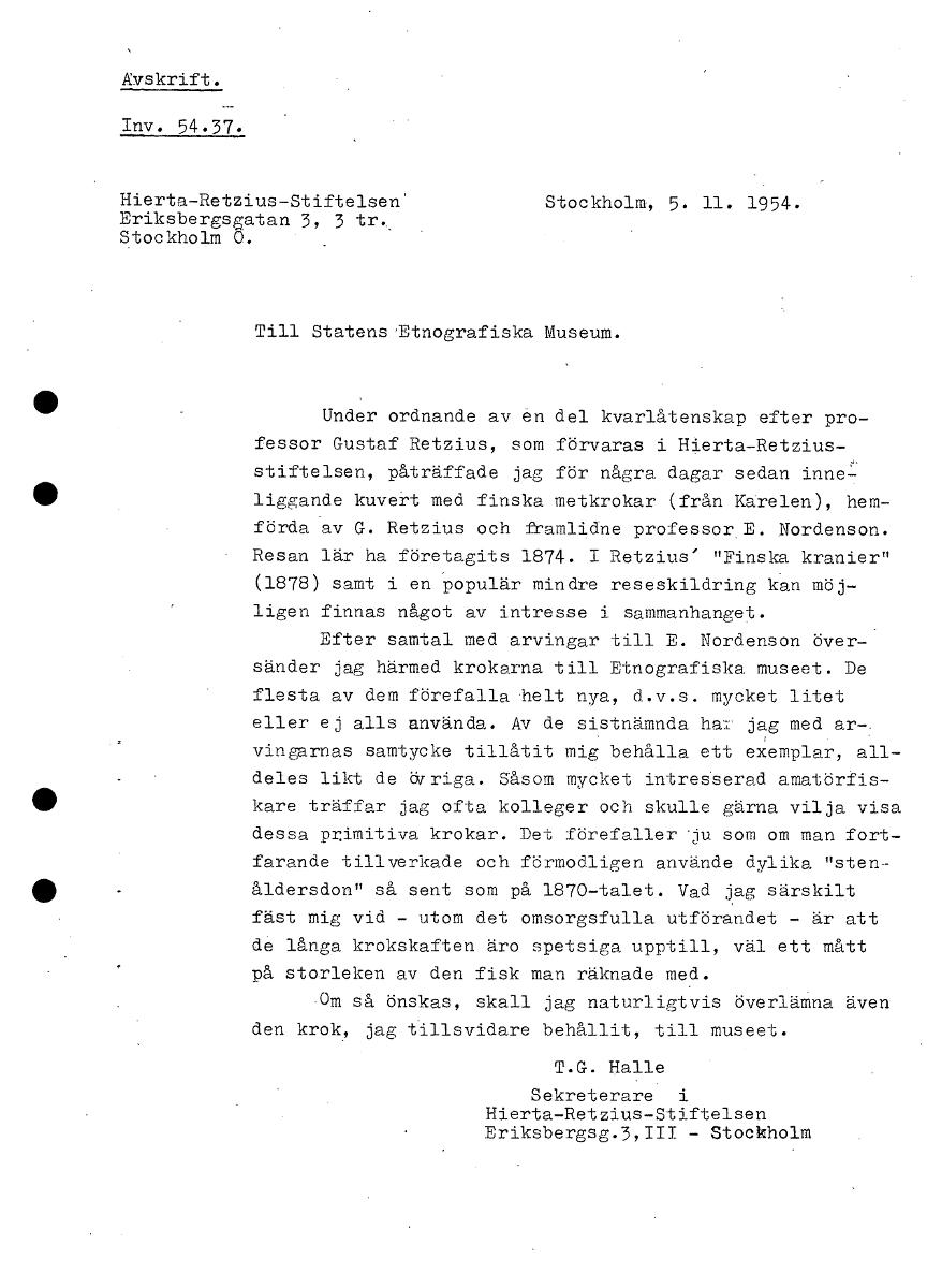 Avskrift. Inv. 54.37. Hierta-Retzius-Stiftelsen' Stockholm, 5. 11. 1954. Eriksbergsgatan 3, 3 tr., Stockholm 0. Till Statens'Etnografiska Museum. • Under ordnande av en del kvarlåtenskap efter pro- fessor Gustaf Retzius, som förvaras i Hierta-Retzius- stiftelsen, påträffade jag för några dagar sedan inne: liggande kuvei-t med finska metkrokar (från Kårelen), hem- förda'av G. Retzius och framlidne professor, E. Nordenson. Resan lär ha företagits 1874. I Retzius' "Finska kranier" (1878) samt i en Populär mindre reseskildring kan möj- ligen finnas något av intresse i sammanhanget. Efter samtal med arvingar till E. Nordenson över- sänder jag härmed krokarna till Etnografiska museet. De flesta av dem förefalla helt nya, d.v.s. mycket litet eller ej alls använda. Av de sistnämnda har jag med ar-. vingarnas samtycke tillåtit mig behålla ett exemplar, all- deles likt de drriga. Såsom mycket intreåserad amatörfis- • kare träffar jag ofta kolleger och skulle gärna vilja visa dessa pr.imitiva krokar. Det förefaller ju som om man fort- farande tillverkade och förmodligen använde dylika "sten- • åldersdon" så sent som på 1870-talet. Vad jag särskilt fäst mig vid - utom det omsorgsfulla utförandet - är att då långa krokskaften äro spetsiga upptill, väl ett mått på storleken av den fisk man räknade med. .0m så önskas, skall jag naturligtvis överlämna även den krok, jag tillsvidare behållit, till museet. T.G. Halle Sekreterare i Hierta-Retzius-Stiftelsen Eriksbergsg.3,III - Stockholm [ocr]