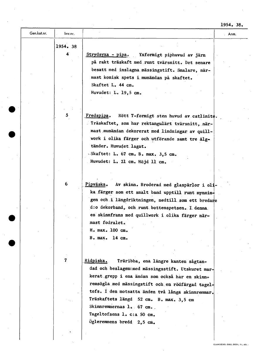 1954. 38. 1954. 38 4 Strydsyxa - pipa. Yxforäigt piPhuvud av järh på rakt träskaft.med.runt tvärsnitt. Det. senare besatt med inslagna mässingstift. Smalare, när- mast konisk spets i_munändan på skaftet. Skaftet L. 44 cm. Huvudet: L. 19,5 cm. 5 Fredspipa. Rött T-formigt sten huvud av.catlinit Träskaftet, som har rektangulärt. tvärsnitt,..när- mast,munändan dekorerat Med.lindningar av quill- work i olika färger och_utförande samt tre älg- tänder. Huvudet lagat. ‘Skaftet: L. 67 cm. B. max. 3,5 cm. Huvudet: L. 21 cm. Höjd 11 cm. 6 Pipväska. Av skinn. Broderad med glaspärlor i ol ka färger som ett smalt band upptill runt mynnin gen och i längdriktningen, nedtill som ett breda e d:o dekorband, och runt bottenspetsen. I denna_ en skinnfrans med quillwork i olika färger när- mast fodralet. H. max. 100 cm. B. max. 14 cm. Ridpiska. Träribba, ena längre kanten sågtan- dad och beslagenmed mässingsstift. Utskuret mar kerat_grepp i ena ändan som också har en skinn? remsögla med mässingstift och en rödfärgad tagel tofs. den motsatta änden två långa skinnremmar. Träskaftets längd 52 cm. B. max. 3,5 cm SkinnremMernas 67 em.. Tageltofsens 1. c:a 50 cm. Ögleremmens bredd 2,5 em. [ocr]