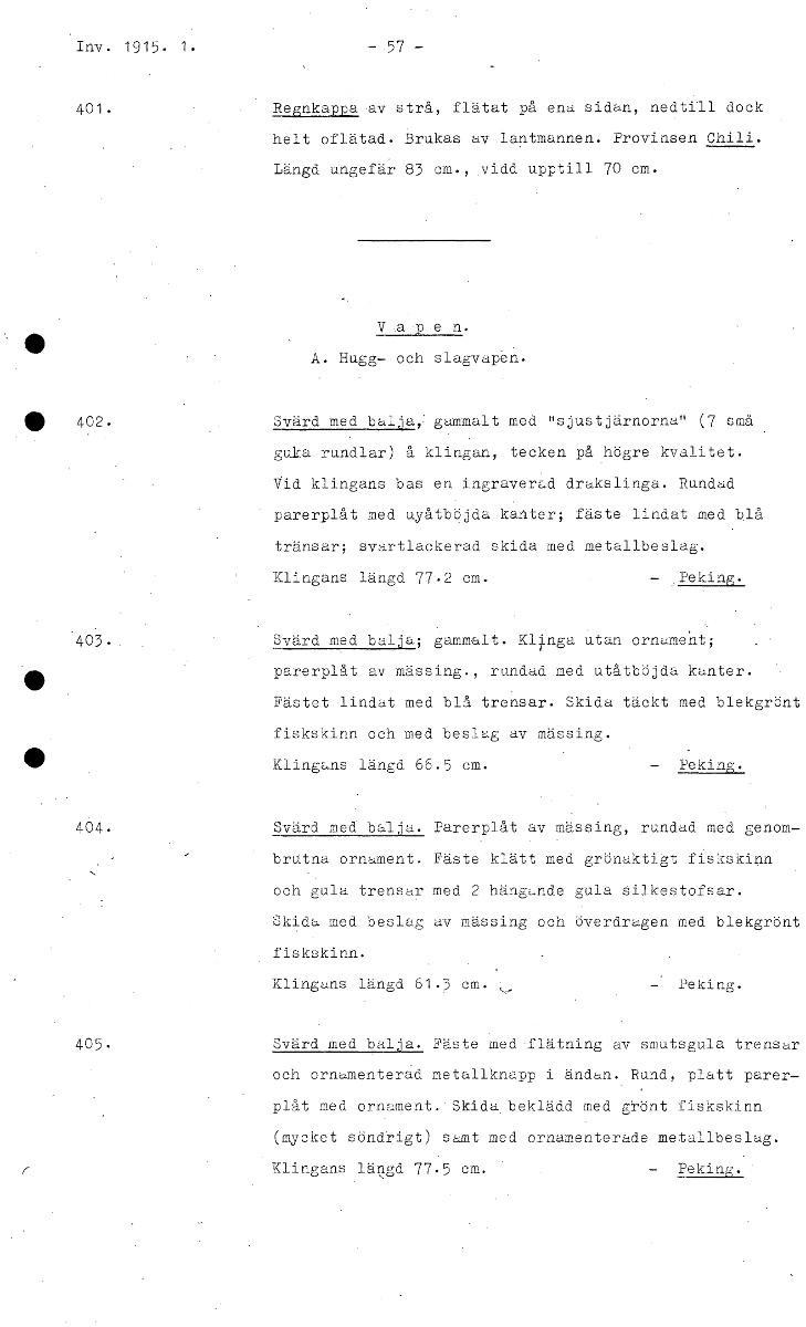 Inv. 1915. 1. - 57 - 401. , Regnkappa av strå, flätat på ena sidan, nedtill dock helt oflätad. Brukas av lantmannen. Provinsen Chili. Längd ungefär 83 cm., vidd upptill 70 cm. V,a -p e n. A. Hugg- och slagvapen. 402. Svärd med balja, : gammalt med "sjustjärnorna" (7 små gula rundlar) å klirigan, tecken på högre kvalitet. Vid klingans bas en ingraverad drakslinga. Rundad parerplåt med uyåtböjda kanter; fäste lindat med blå tränsar; svartlackerad skida med metallbeslag. Klingans längd 77.2 cm. - .Peking. 403. Svärd med balja; gammalt. Kll_nga utan ornament; parerplåt av mässing., rundad med utåtbjjda kanter. Fästet lindat med blå trensar. Skida. täckt med blekgrönt fiskskinn och 'med beslag av mässing. Klingans längd 66.5 cm. Peking. 404. Svärd med balja. Parerplåt av mässing, rundad med genom- brultna ornament. Fäste klätt med grönaktit fiskskinn och gula trensar med 2 hängande gula silkestofsar. Skida med beslag av mässing och överdragen med blekgrönt fiskskinn. Klingans längd 61.3 cm. - Peking. 405. Svärd med balja. Fäste med flätning av smutsgulor trensar och ornamenterad metallknapp i ändan. Rund, platt parer- plåt med ornament. Skida. beklädd med grönt fiskskinn (mycket söndrigt) samt med ornamenterade metallbeslag. Klingans längd 77.5 cm. - Peking. [ocr]