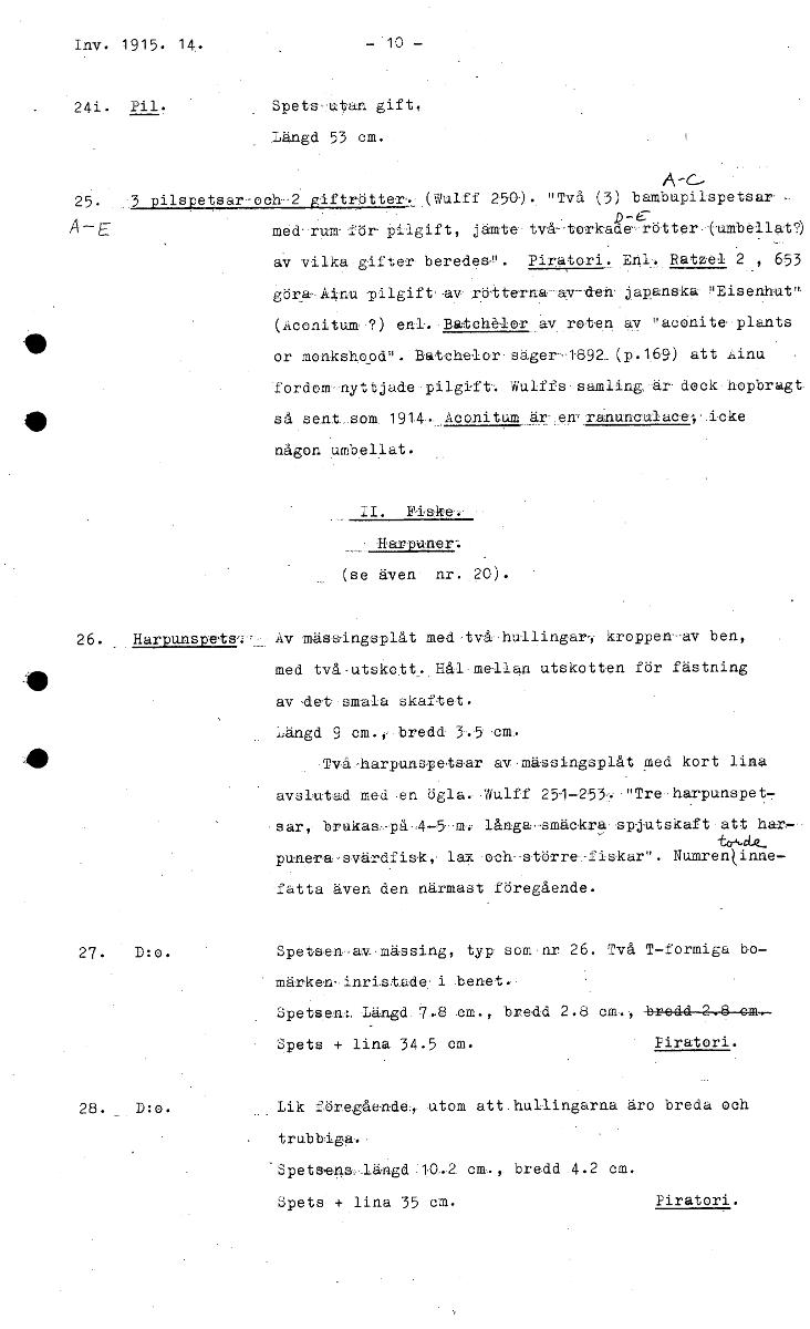 • Inv. 1915. 14. -010 - 24i. Pil. Spets utan gift. . Längd 53 cm. 25. pilspetsar-och--2 giftr.ötte-r,. (Wulff 250-). "Två (3) bambu.pilspetsar -- D- 67 - E för- pilgift, jämte- två-torkade-rö•tter-(-u.m... Visa hela