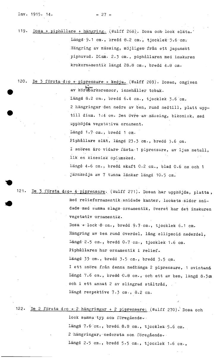 Inv. 1915. 14. - 27 - 119. Dosa + piphållare + hängring. (Wulff 268). Dosa och- lock släta.' Längd 9.1 cm., bredd 8.2 cm., tjocklek 3.6 cm. Hängring av mässing, möjligen-från ett japanskt piphuvud. Diam. 2.3 cm., piphållaren med inskuren krokornamentik längd 28.8 cm., bredd 4.8 cm. 120. De 3 första-da +-piprensare+ kedja. (Wulff 269). Dosan, omgiven av kärOkarksremsor, innehåller tobak. Längd 8:2 cm., bredd 6.4 cm., tjocklek 3.6 cm. 2 hängringar-den-nedre• av ben, rund nedtill, platt upp- till diam. 1:4. cm. Den övre•av-mässing, bikonisk, med upphöjda vegetativa ornament. Längd 1.7-cm..., bredd 1 cm. Piphållare slät, längd 23.3 cm., bredd 3.6 cm. I. snören äro-vidare-fästa-1 piprensare, av ljus metall, lik- en kinesisk opiumsked. Längd- 4.6 am,', bredd skaft 0.2 em-, blad 0.6 cm och 1 järnkedja av 7 tunna länkar längd 10.5 cm. 121. De 3 första d: o+ 4.piprensare: (Wulff 271). Dosan har upphöjda, platta, led reliefornamentik-snidade kanter, lockets ,sidor sni- dade med samma slags-ornamentik, överst har det inskuren vegetativ. ornamentik. Dosa -+ lock.8 cm., bredd 9.7 cm., tjocklek 6.1 cm. Hängring av ben rund överdel, lång ellipsoid nederdel, Längd-2.5 cm., bredd 0.7 cm., tjocklek 1.6 cm. Piphållaren har ornamentik i relief. Längd- 33 cm., bredd 3.5 cm., bredd 3.5 cm. I ett snöre från denna nedhänga 2 piprensare, 1 svintand. Längd 7.6 cm., bredd -0.8 cm., och ett av ben-, längd 8.3cm och i ett annat 2 av slingrad ståltråd, längd respektive 7.3 cm., 8.2 cm. 122. De 2 första d:.o.+-2.hängrimgar + 2 piprensare. (Wulff 270). Dosa och lock samma ,typ som. föregående, .Längd bredd, .8.8 em., tjocklek-5.6 cm. 2 hängringari-neder•ta som•föregående, Längd 2.5 cm., bredd 5.5 cm., tjocklek 1.6 cm., [ocr]