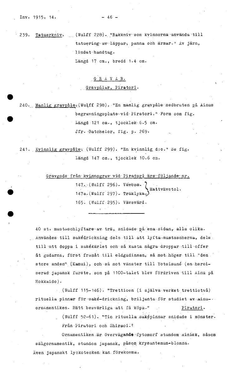 _ Inv. 1915. 14. - 46. - 239. Tatuerkniv (Wulff 228). "Rakkniv som- tatuering-av-läppar-i panna och ärmar." Av järn, lindat -handtag. Längd 17 cm., bredd 1.4 cm. GRAVA R. Gravpålar, Firatori. 240. Manlig graviDåle(Wulff 298). "En manlig grgvpåle nedbruten på Minus begravningspIats-vid Piratori." Form som fig. Längd 121 cm., tjocklek. 6.5 cm. Jfr. Batchelor, fig. p. 269. 241. Kvinnlig :gravpåle (Wulff 299). "En kvinnlig d:o." Se fig. Längd 147 cm., tjocklek 10.6 cm. • Gravgods' från. kvinnograv vid- Piratori äro -följande-nr. 147.. (Wulff 296). Vävbom.. Mattvävstol. 147a. (Wulff 297). Träklyka 165. ( Wulff 29.5) . Vävsvärd. 40 st.. mustaschlyftare-av_trä, shidade-påena-sidanr alla olika. Användes -till sakgdrickning•dels•till..att lyfta,Mustascherna dels. till-att doppa i sakekärlet ach-så:kasta-någradroppar.till.offer åt gudarna, först framåt_till-eldgudinnan,•-så mot. höger till. "den.. store anden"- (Kamui), och-så-mot vänster till .Yotsisung--(en---heroi- serad. japansk furste, som på 1100-talet-blev fördriven till Kims på Hokkaido). • . (Wulff 115-1.46,) "Trettioen, (i sjäivaverket trettiotvå) rituella-pinnar för-sake-drickning, briljuntaför studiet.av,ainu--. ornamentiken. Rätt besvärliga att få köpa." Piraten. (Wulff 52-61). "Tio rituella sakOpinnar snidade i mönster. Från Piratori och Shirgoi. Ornamentiken,är övervägande.fytomorf stundom .ainisk, såsom sälgornamentik, stundom japansk, åsom krysantemum-blomma. Även japanskt lyckotecken kan förekomma. [ocr]