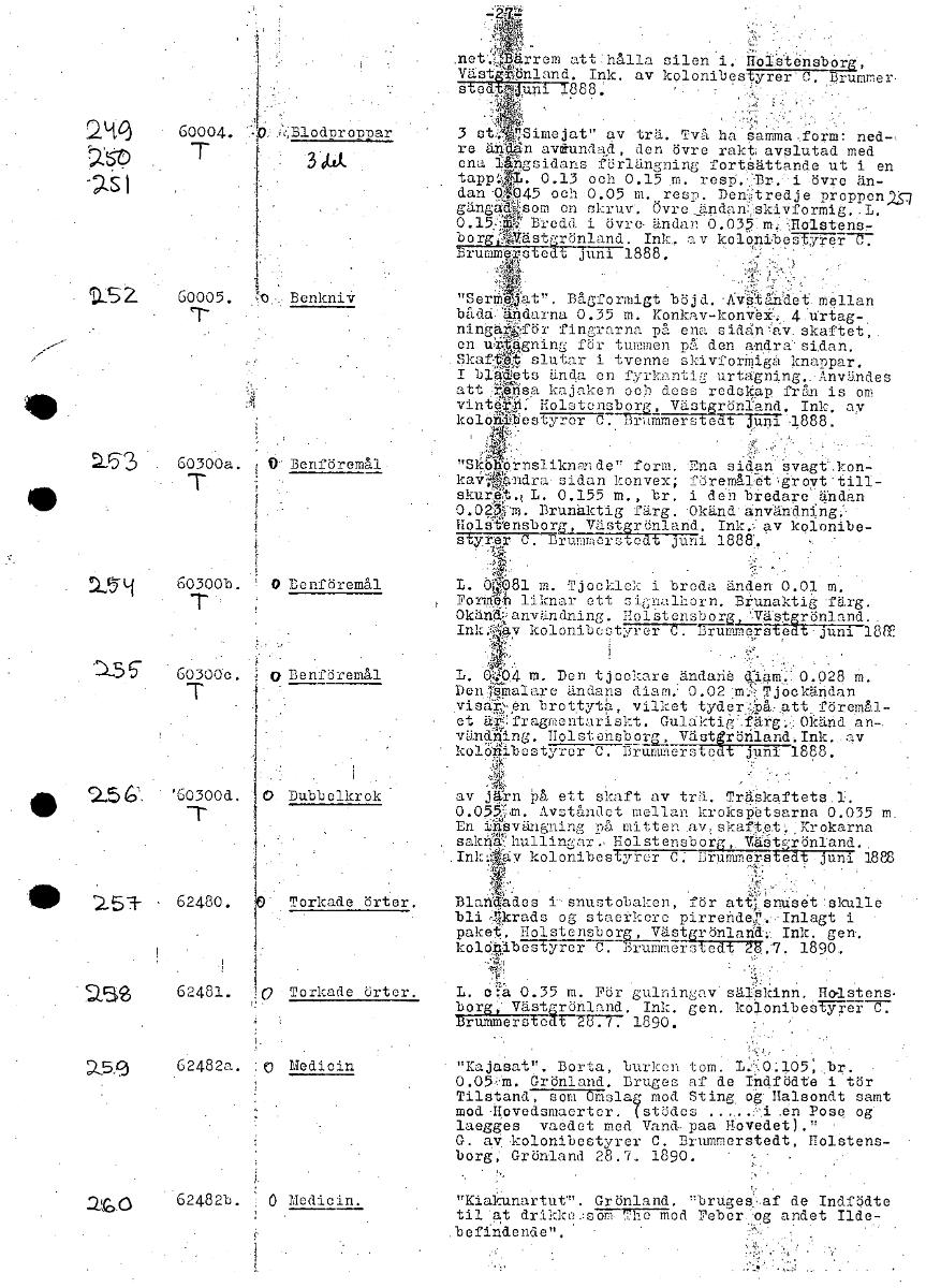 .net arrem att: hålla silen 1..'ffoi.slensberg, VastgrOnland. Ink. av kolonibestyrer'C. Brummer. StedtPluni 1888. 2'4g Blodproppar 3 st..Simejat" av trä. Två ha samma.form: ned- T re älygn avulundad, ...
