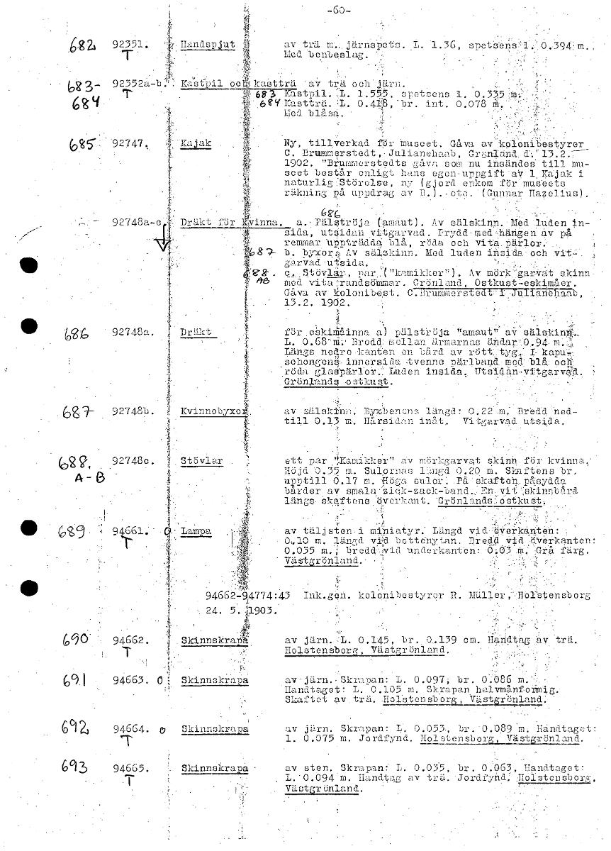 -Go- a/ 92351, Handspjut av trä m. järnspets 1. 1.3 6, Med benbeslag. u? 7,3— 92352a Kastpil ••• ochf.kaåtträ av trä och järn. fr 68.3 Kastpil.L4. 1.555, spetsens 1. 0.33,5M..- 6V-1 Kastträ. 0.42 , 'br. int . 0.078 ä. Med blåsa. Ny, tillverkad för museet. Gåva ev kolonibestyrer C. Drummerstedt,-Julianehaab, G=land 1';13.2. 1902. "Brummerstedts gåva som nu insändes till mu- seet består huns egen uppgift aV 1 Kajak i naturlig.Störelse, ng (gjord enkorn för museets räkning på uppdrag av D.)..ctc. (Gunnar Hazelius). Cg 92748a-c, Dräkt för kvinna. a. Pälsc tröj z (amaut). Av sälskinn. Med'luden in- sida; utåidan vitgarvad. Prydd med-hängen av på remmar uppträdda blå, röda och vita pärlor.- ‘,1r.?- b. hyxor• Av sälskinn. Med luden insida och Vit-. garvad utsida. c,Stövlar, par:("kamikker"). Av mörk"garVat skinn med vitarandsöMmar. Grönland, Ostkust.-eskimåer. Gåva av kolonibest. C.Brummerstedt'i Julianehaab, 13.2. 1902. föreSkiffiåinna a) pälströjä !!amaut”' av L. 0.68-å:' Bredd llan ärmarnas ändarf0,94i Längs nedre,kanten en bård av rutt:. tyg. L schongeninnersida tvenne pärlband'med:11å:oci röda gla&pärler,r. Luden insida, Utsidan,vitgarva/d. Grönlands estkust. 31--- KvinnobyxolK av sälskiAln: Dyy:lenens längd: 0.22 Bredd. ned- till 0.13 m. Hårsidan inåt. Vitgarvad utsida. 92748c. Stövlar ett par ''Kamikker" av märl garvat skinn för kvinna.. Höjd 0.35 m.. Sulornas längd 0.20 m. Skaftens Dr. A-- upetill 0.17 m. fr:öga sulor: .Då'skaften.påsydda bårder av-smala'Siek-zack-band.:En. k vitsinnård b längs skaiftens överkant. "Grönlands ,estkuåt, , .- • Ge av täljsten- i 1-4inatyr: Längd vidöVerkanten: 0,10 m, längd vid bottenytan. DreAdVidbVerkanten: 0.035 m. bredd'jVid underkanten: 0,03 M. Grå färg. ' Västgrönland.-.- Ink.gen. kolonibestyrcr R. Miller, erstensborg 24. 5. 1903. 690 SkinnskraYsa hr. 0,139 trä. T Eolstensborg, VästFröniand. 691 Skinnskrapa av'järn.•Skrapan: L. 0.097; Dr. ffi: Handtaget: L. 0.105 m. Skrapan. halvmånformig.' Skaftet av trä. Eolstensborg, Västgrönland: 692 a Skinnskrapa av järn. Skrapan: L. 0.053, br.'0.0.89M. Handtaget: 1. 0.075 m. Jordfynd. Holstensborg, Västgrönland. 693 sten. Skrapan:. L. 0.035, Dr. 0.063, Handtaget: m. Handtag av trä. Jordfyndf; :Hoistensborg, Västgrönland. [ocr]