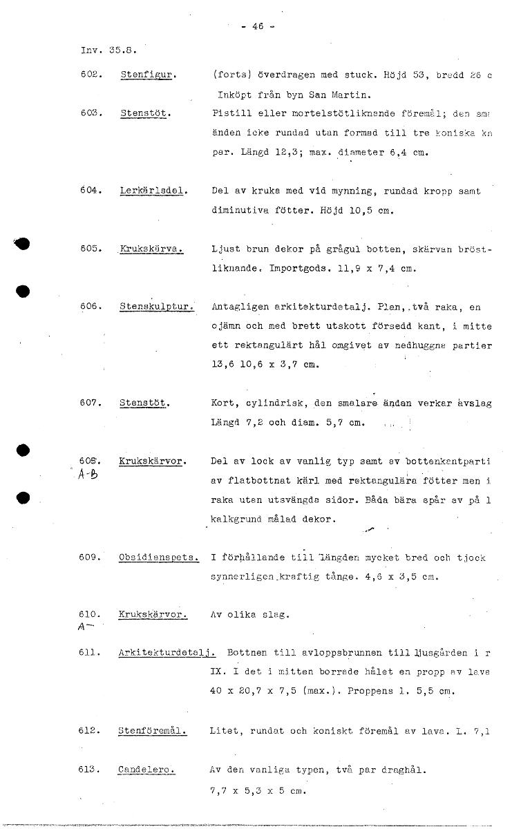 - 46 Inv. 35.8. 602. Sta/if:Ler. (forts) överdragen med stuck. Höjd 53, bredd c, Inköpt från byn San Martin. 603. Stenstöt. Pistill eller mortelstötliknande föremål; den smf änden icke rundad utan for...