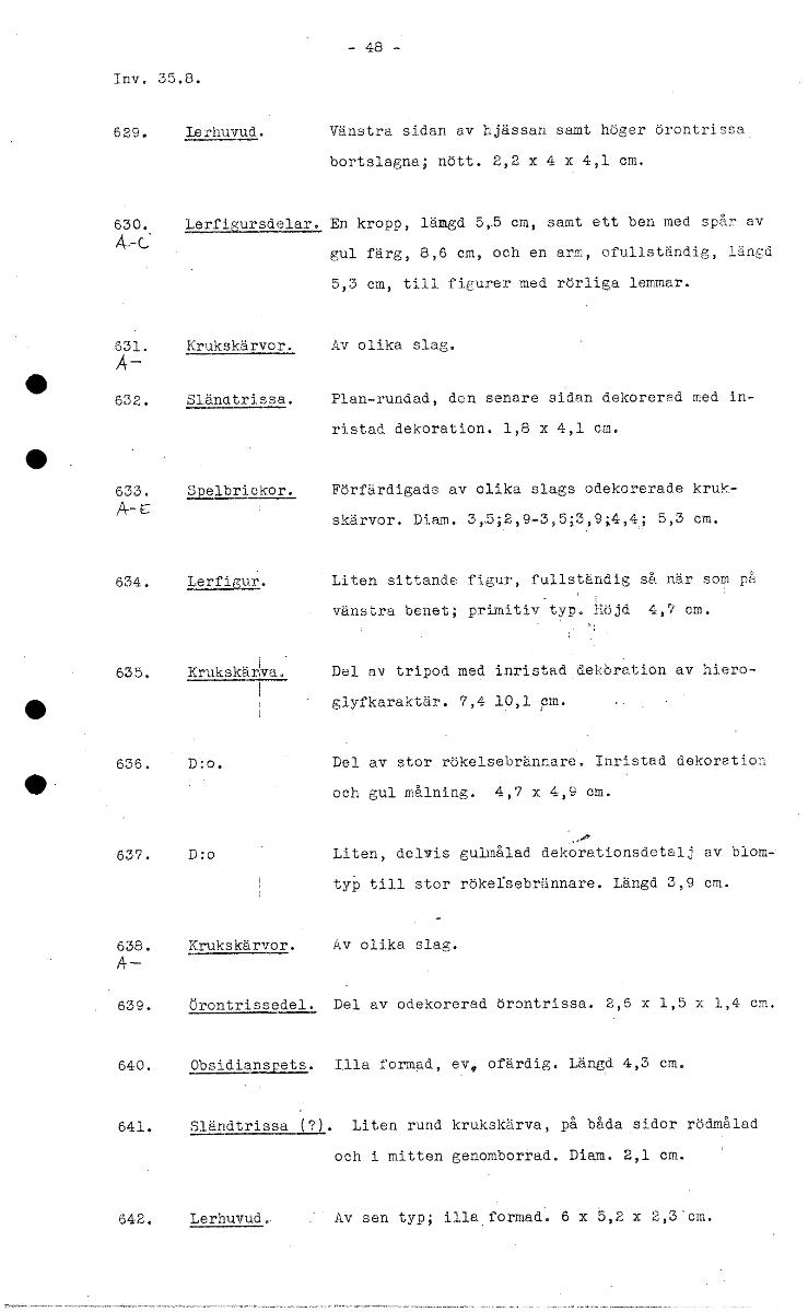 - 48 - Inv. 35.8. 629. lerhuvud. Vänstra sidan av hjässan samt höger örontrissa. bortslagna; nätt. 2,2 x 4 x 4,1 cm. 630. Lerfigursdelar. En kropp, längd 5,.5 cm, samt ett ben med spår av gul färg, 8,...