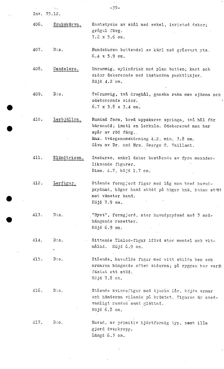 35 Inv. 35.12. Krukskärva. Kantstycke av skål med enkel, inristad dekor; grågul färg. 7.2 x 5.6 cm. D:o. Rundskuren bottendel av kärl med gråsvart yta. 6.4 x 5.9 cm. Candel ro. Enrummig, cylindrisk med plan botten; kant och sidor dekorerade med instuckna punktlinjer. Höjd.4.2 'cm. D:o. Tvårummig, två draghål, ganska raka men ojämna och °dekorerade sidor. • 6.7 x 3.8 x 3.4 cm'. 410. 12132.1-411ra. Rundad form, bred uppskuren springa, två hål för bärsnodd; inuti en lerkula. Odekorerad men har 00 spår av röd färg., Max. tvärgenomskärning 4.2, min. 3.8 cm.. Gåva av Dr. and Mrs. George C. Vaillant. 411. Sländtrissa. Inskuren, enkel dekor bestående av fyra meander- liknande figurer. Diam. 4.7, höjd 1.7 em. 412. LerflaaL Stående formgjord figur med låg men bred huvud- prydnad, höger hand stödd på höger knä, hakan stöld mot vänster hand. • Höjd 7.9 cm. 413. ."Byst", formgjord, stor huvudprydnad. med. 3 ned- • hängande rosetter. Höjd 6.9 cm. 414. D:o. Sittande Tlaloc-figur iförd stor mantel och vit- målad, Höjd 6.9 cm. 415. D:o. Stående, huvudlös figur med vitt skilda ben och armarna hängande efter sidorna; på ryggen har varit fästat ett stöd. Höjd 7.8 cm. 416. Stående kvinnofigur med tjocka lår, böjda armar och händerna vilande på bröstet, Figuren är osed- vanligt rundad samt glättad. Höjd 6.8 cm. 417. D:o. Huvud, av primitiv hjärtformig typ, samt illa gjord överkropp. Längd 6.3 cm. [ocr]