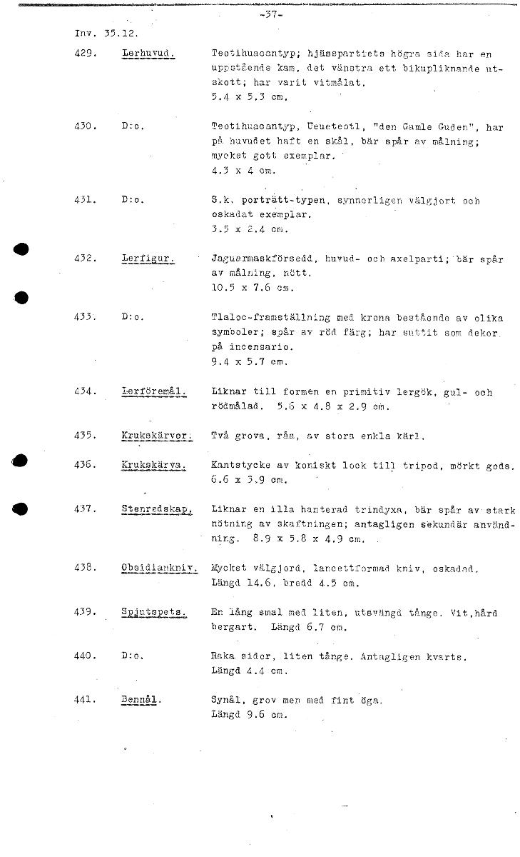 Inv. 35.12. 429. Lerhuvud. Teotihuacantyp; hjässpartiets högra sida har en uppstående kam, det vänstra ett bikupliknande ut- skott; har varit vitmålat. 5,4 x 5.3 cm. 430. D:o, Teotihuacantyp, Ueueteotl, "den Gamle Guden", har på huvudet haft en skål, bär spår av målning; mycket gott exemplar. 4.3 x 4 cm. 431. D:o. S.k. porträtt-typen, synnerligen välgjort och oskadat exemplar. 3.5 x 2.4 cm. 410 432. 141111.1rin • Jaguarmaskförsedd, huvud- och axelparti; bär spår av målning, nött. 10.5 x 7.6 cm. 433. D:o. Tlaloc-framställning med krona bestående av olika symboler; spår av röd färg; har suttit som dekor. på incensario. 9.4 x 5.7 cm. 434. Lerföremål. Liknar till formen en primitiv lergök, gul- och rödmålad. 5.6 x 4.8 x 2.9 cm. 435. Krukskärvor. Två grova, råa, av stora enkla kärl. Krukskärva. Kantstycke av koniskt lock till tripod, mörkt gods. 6.6 x 3.9 om. OM, 437. Stenredsku. Liknar en illa hanterad trindyxa, bär spår av stark nötning av skaftningen; antagligen sekundär anvönd- ning. 8.9 x 5.8 x 4.9 om. 438. Obsidiankniv. Mycket välgjord, lancettformad kniv, oskadad. Längd 14.6, bredd 4.5 cm. 439. 2212.12.2.9.t.8, En lång smal med liten, utsvängd tånge. Vit,hård bergart. Längd 6.7 cm. 440. D:o. Raka. sidor, liten tånge. Antagligen kvarts. Längd 4.4 cm. 441. Bennål. Synål, grov men med fint öga. Längd 9.6 cm. [ocr]