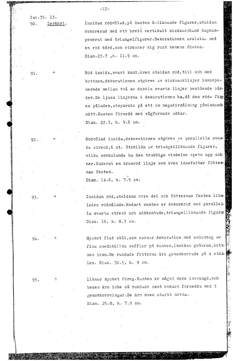 • -12- Inv.35. 13. 90. Lerkärl. Insidan rödmälad,på kanten S-liknande figurer,utsidan dekorerad med ett brett vertikalt sicksackband hopkom- ponerat med triangelfigurer.Dekorationen avslutas med en röd ... Visa hela