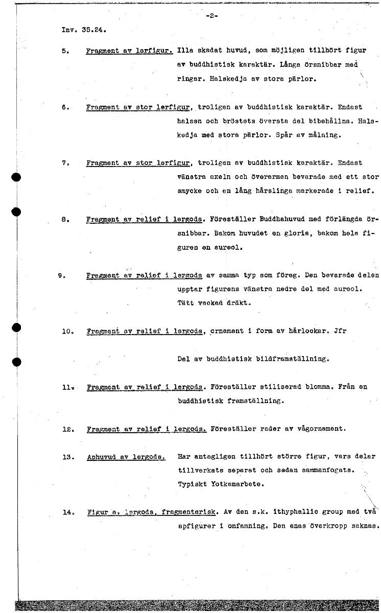Inv. 35.24. 5. Fragment av lerfigur. Illa skadat huvud, som möjligen tillhört figur av buddhistisk karaktär. Långa örsnibbar med ringar. Halskedja av stora pärlor. 6. Imment av stor lerfigur, troligen...