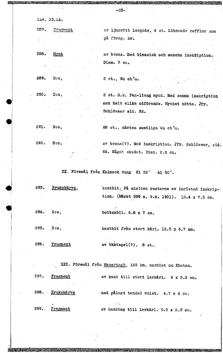 Inv. 33.24. 237. 27qVulk av ljusrätt lergods, 4 st. Liknande refflor som på föreg. nr. zae. Mynt av brons. Med kinesisk och manchu insktiption. Diam. 5 289. D:o, 2 sto, Viu oh'u. 286. D:o, 2 st. S.k. Pan-liang mynt. Med samma inskription men helt olika utförande. Mycket nötta. Jfr. Schlösser sid. 52. 287. D:o, 68 s ., nästan samtliga Vu chpu. 288. D:o, av brons(?). Med inskription. Jfr. Schlösser, sid. 66. Något skadat. Diam. 2.6 cm. XX. Föremål från Kolmack dung 81 52' 41 50'. 293. Krukskärva, kantbit. På utsidan resterna av inristad inskrip- tion. (Märkt 599 a, 9.4. 1931). 10.4 x 7.5 cm. 294. D:o„ bottenbit. 6.8 x 7 cm. 295. D:o, kantbit från stort kärl. 12.5 x 8.7 gm. 296. E32122.311 av taktegel(?), 8 st.. XXI. Föremål från Mazartaph, 165 km. nordöst om Khotan. 297. Fragment av kant till stort lerkärl. 6 x 3.3 cm. 298. Krukskärva med pålagd tandad vulst. 4.7 x 4 cm. 299. nstgment • av handtag till lerkärl. 5.5 x 2.5 om. [ocr]