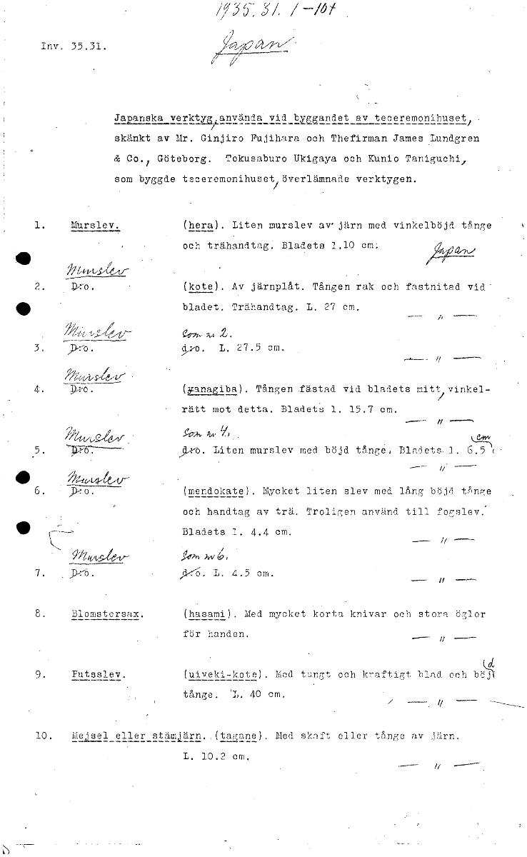 /7 ;c5/ /—/b/ Inv. 35.31. Imans112.1trktu,använda vid bandet av teceremonihuset skänkt av Mr. Ginjiro Fujihara och Thefirman James Lundgren & Co./ Göteborg. Tokusaburo Ukigaya och KUnio Taniguchi, som byggde t• ceremonihuset överlämnade verktygen. 1. Murslev. (hera). Liten murslev av.järn med vinkelböjd tånge och trähandtag. Bladets 1.10 cm; 2. (kote). Av järnplåt. Tången rak och fastnitad vid' bladet. Trähandtag. L. 27 cm. ern , 3 )5•:-O . o. L. 27.5 cm. 4. (raaiba). Tången .fästad vid bladets mitt / vinkel- rätt mot detta. Bladets 1. 15.7 cm. %6 5. teö. Liten murslev med böjd tånge, Bladets. 1. 6.5( (mendokate). Mycket liten slev med lång böjd Vinge och handtag av trä. Troligen använd till fogslev: Bladets 1. 4.4 cm. Mit ^ r j..096. Ätt/ 6, 7. L. 4.5 cm. 8.. Blomstersax. (hasami). •Med mycket korta knivar och stora öglor för handen. 9. Futsslev. (uiveki-kote). Med tungt och kraftigt blad och 1).'jl tånge. 40 cm. 10. Mejsel eller stämlärn. (tagane). Med skaft eller tånge av järn. L. 10.2 om. [ocr]Stäng