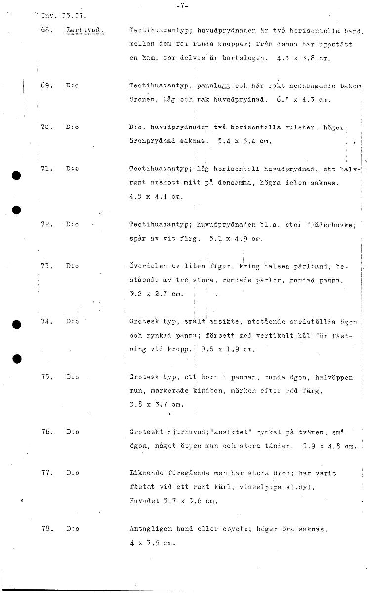 -7- ' Inv. 35.37. 68. Lerhuvud. Tectihuacantyp; huvudprydnaden är två horisontella band, mellan dem fem runda knappar; från denna har upnst?!tt en kam, som delvisär bortslagen. 4.3 x 3.8 cm. D:o Teoti...