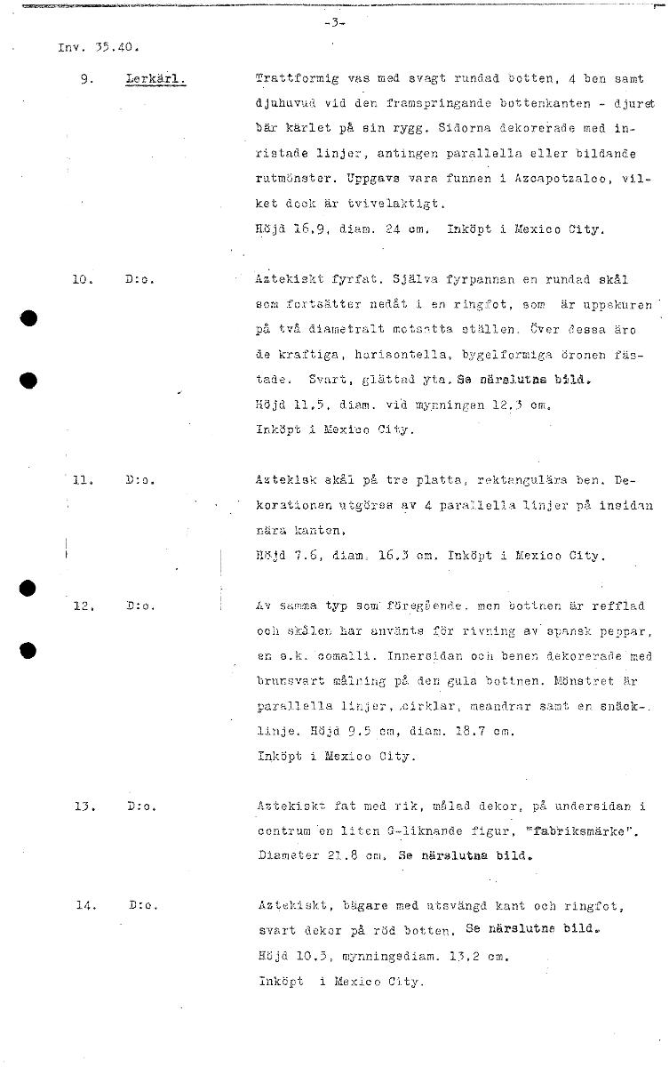 -3- Inv. 9. Lerkärl. Trattformig vas med svagt rundad botten, 4 ben samt djuhuvud vid den framspringande bottenkanten - djuret bär kärlet på sin rygg. Sidorna dekorerade med in- ristade linjer, antingen parallella eller bildande rutmönster. Uppgavs vara funnen i Azcapotzalco, vil- ket dock är tvivelaktigt. Höjd 16,9, diam. 24 em. Inköpt i Mexico City. 10. D:o. Aztekiskt fyrfat. Själva fyrpannan en rundad skål som fortsätter nedåt i en ringfot, som är uppskuren på två diametralt mots-tta ställen, Över c,,ssa äro de kraftiga, horisontella, bygelformiga öronen fäs- tade. Svart, glättad yta, Se na slutna bild. Höjd 11.5, diam, vid mynningen 12.3 cm. Inköpt i Mexico City. iii :o. Äztekik skål på tre platta, rektangulära ben. De- korationen utgöres av 4 parallella linjer på insidan n. re kanten. Höjd 7.6, diam. 16.3 cm. Inköpt i Mexico City. 12. Av samma typ c.'m'föregående, men bottnen är reffiad och skålen har använts för rivning av'sransk peppar, en s.k, comalli. Innersidan och benen dekorerade med brunsvart målning på den gula bottnen. Mönstret är parallella linjer„cirklar, meandrar samt en snäck-, linje, Höjd 9.5 cm, dian. 18.7 cm. Inköpt i Mexico City 13. D:o. Aztekiskt fat med rik, målad dekor, på undersidan i centrum 'en liten G-liknande figur, "rabriksmärke". Diameter 21.8 cm, Se närslutna bild. 14. D:o. Aztekiskt, bägare med utsvängd kant och ringfot, svart dekorpa .2 röd ro, botten. Se närslutnn bild. Höjd 10. 5, mynningsdiaå. 13.2 cm. Inköpt i Mexico City. [ocr]