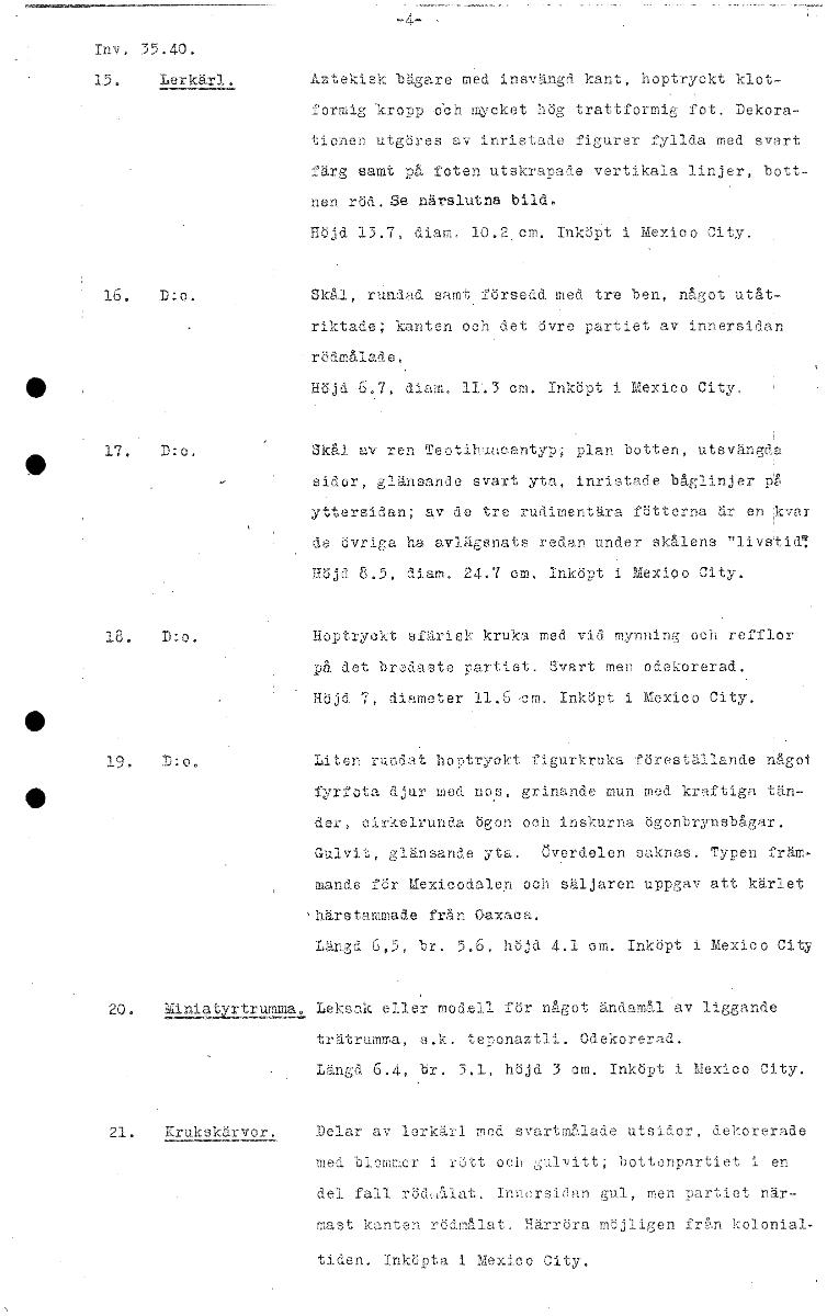 -4- Inv. 35.40. 15. Lerkäri,Aztekisk bägare med insvängd kant, hoptryckt klot- fornrit kropp 6ch mycket hög trattformig fot. Dekora- tionen utgöres av inristade figurer fyllda med svart färg samt på foten utskrapade vertikala linjer, bott- nen röd. Se närslutna bild. Höjd 13.7, diam. 10.2 cm, Inköpt i Mexico City. 16. D:o. Skål, rundad samt försedd med tre ben, något utåt- riktade; kanten och det övre partiet av innersidan rödmålade. Höjd 6.7, diam. 11Y3 cm. Inköpt i Mexico City. 17. Skål av ren Tectibuncantyp; plan botten, utsvängda sidor, glänsande svart yta, inristade båglinjer olg yttersidan; av de tre rudimentära fötterna år en kvar de övriga ha avläsnats redan under skålens "livstid.Tiöjd 8.5, diam, 24.7 cm. Inköpt i Mexico City. 18. D:o, Hoptryckt sfärisk kruka med vid mynning och refflor på det bredaste partiet. Svart men °dekorerad. Höjd 7, diameter 11.6 em. Inköpt i Mexico City. 19. D:o, Liten rundat hontryckt figurkruka föreställande något fyrfota djur med nos, grinande mun med kraftiga tän- der, cirkelrunda ögon och inskurna ögon'crynsbågar. Gulvit, glänsande yta överdelen saknas. Typen främ- mande för Mexicod.alen och säljaren uppgav att kärlet härstammade frän Oaxaca. Längd 6,5, hr. 5.6, höjd 4.1 cm. Inköpt i Mexico City 20. Miniatyrtrumrna. Leksak eller modPll för något ändamål av liggande trätrumma, s.k. teponaztli. ,dekorerad. Längd 6.4, b. 3.1, höjd 3 cm. Inköpt i Mexico City. 21. Krukskärvor. Delar av lerkärl med svartm.åiade utsidor, dekorerade med blemmor i rött och ulA,iitt; bottenpartiet i en del fall röduiålat. Inm:rsician. gul, men partiet när- mast kanten rödmlat. Härröra möjligen från kolonial- tiden. Inköpta i Mexico City. [ocr]