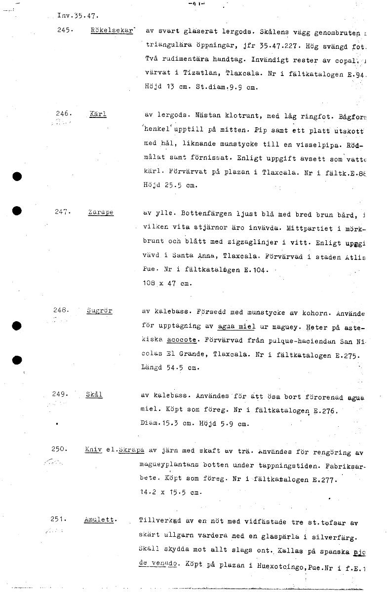 Inv.35.47. Rökelsekar' av svart glaserat lergods. Skålens vägg genombruten r. triangulära öppningar, jfr 35.47.227. Hög svängd fot. Två rudimentära handtag. Invändigt rester av copal'.:1 värvat i Tizatlan, Tlaxcala. Nr i fältkatalogen Höjd 13 cm. St.diam.9.9 cm. Karl av lergods. Nästan klotrunt, med låg ringfot. Bågforn henkellupptill på mitten. Pip samt .ett platt utskott med ,hål, liknande munstycke till en visselpipa. Röd- målat samt förnissat. Enligt uppgift avsett som vatte kärl. Förvärvat på plazan i Tlaxcala. Nr i fältk.E8e. Höjd 25.5 cm. Zarape av ylle. Bottenfärgen ljust blå med bred brun bård vilken vita stjärnor äro invävda. Mittpartiet i mörk- brunt och blått med zigzaglinjer i vitt. Enligt upggi vävd. i Santa Anna, Tlaxcala. Förvärvad i staden Atlis Pue. Nr i fältkatalcbgen E.104. 108 x 47 cm. Sugrör av kalebass. Försedd med munstycke av kohorn. Använde för upptagning av agua miel ur maguey._Heter på azte- kiska acocote. Förvärvad från pulque-haciendan San Ni, colas El Grande, Tlaxcala. Nr i fältkatalogen E.275. Längd 54.5 cm. Skål av kalebass. Användes 'för att ösa bort förorenad agua miel. Köpt som föreg. Nr i fältkatalogen E.276. • Diam.15.3 cm. HOjd 5.9 cm. 250. Kniv el.Skrapa av järn med skaft av trä. användes för rengöring av magueyplantans botten under tappningstiden. Fabriksar- bete. Köpt som föreg. Nr i fältkatalogen E.277. 14.2 x 15.5 cm. 251. Amulett. Tillverkad av en nöt med vidfästade tre st.tofsar av skärt ullgarn vardera med en glaspärla i silverfärg. Skall skydda mot allt slags ont,_Kallas.på spanska £12 devendo. ,Köpt på plazan i Huexotcingo,Pue.Nr i f.E.1 [ocr]