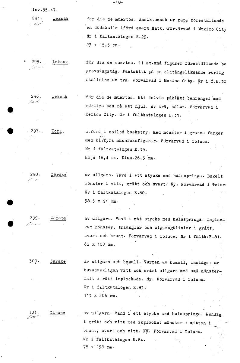 Inv.35.47• 294• Leksak för dia de muertos. Ansiktsmask av papp' föreställande en dödskalle.iförd svart hatt.•Förvärvad i Mexico City Nr i fältkatalogen E.29. 23 x 15,5 cm. 295. Leksak för dia de muertos. 11 st•små figurer föreställande be gravningståg. Fastsatta på en eldtångsliknande rörlig ställning av trä. Förvärvad i Mexico City. Nr i f.E.30 296. Leksak för dia de muertos. Ett delvis påklätt benrangel'med rörliga ben på ett hjul. Av trä, målat. Förvärvad i Mexico City. Nr i fältkatalogen E.,31. 297.. Korg, utförd i coiled basketry. Med mönåter i granna färger med blyfyra människofigurer. Förvärvad i Toluca. Nr i fältkatalogen E•35• Höjd 18,4 cm. Diam.26,5 cm. 298. Zarate' av ullgarn. Vävd i ett stycke med halsspringa. Enkelt mönster i vitt, grått och svart. Ny. Förvärvad i Toluv• Nr i fältkatalogen E.80• 58,5 x 94 cm. 299. Zarape av ullgarn. Vävd i ett stycke med halsspringa. Inploc- kat mönster, trianglar och zig-zagälinler i grått, svart och brunt. Förvärvad i Toluca. Nr i fältk.E.81• 62 x 100 cm. 309. Zarape av ullgarn och bomull. Varpen av bomull, inslaget av huvudsakligen vitt och svart ullgarn med små mönster- fält i rött inplockade. Ny. Förvärvad i Toluca. Nr i fältkatalogen E.83• 113 x 206 cm. 301. Zarape av ullgarn. Vänd i ett stycke med halsspringa. Randig i grått och vitt med inplockat mönster i mitten i brunt, svart och vitt.-W—Förvärvad i TOluca. Nr i fältkatalogen E.84• 78 x 158 cm. [ocr]
