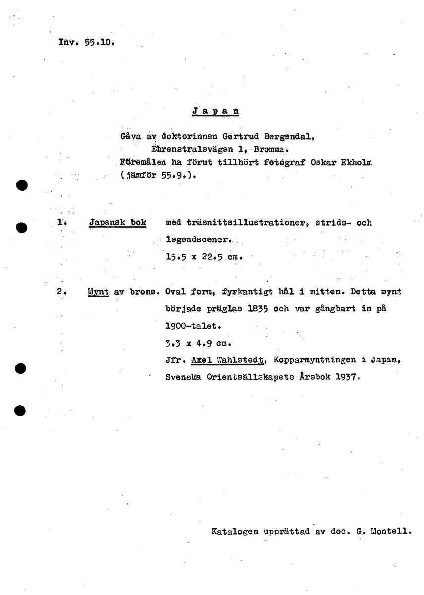 Znv.. 55.10. Ja. p a n Gåva av doktorinnan Gertrud Bergenda19 Bhrenstralsvägen 1, Bromma. Föremålen ha förut tillhört fotograf Oskar Ekhalm (jämför 55.94. • • I. Japansk bok med träsnittsillustrationer, strids- och legendscener, 15.5 x 22.5 om. 2.. pini av brons. Oval form,. fyrkantigt hål i mitten. Detta mynt började präglas 1835 och var gångbart in på 1900-talet. 3.3 x 4.9 om. • Jfr.. Axel Wahlstedt, Kopparmyntningen i Japan, ' Svenska Orientsällskapets Årsbok 1937. • Katalogen upprättad av doc. G. Montell. [ocr]Stäng