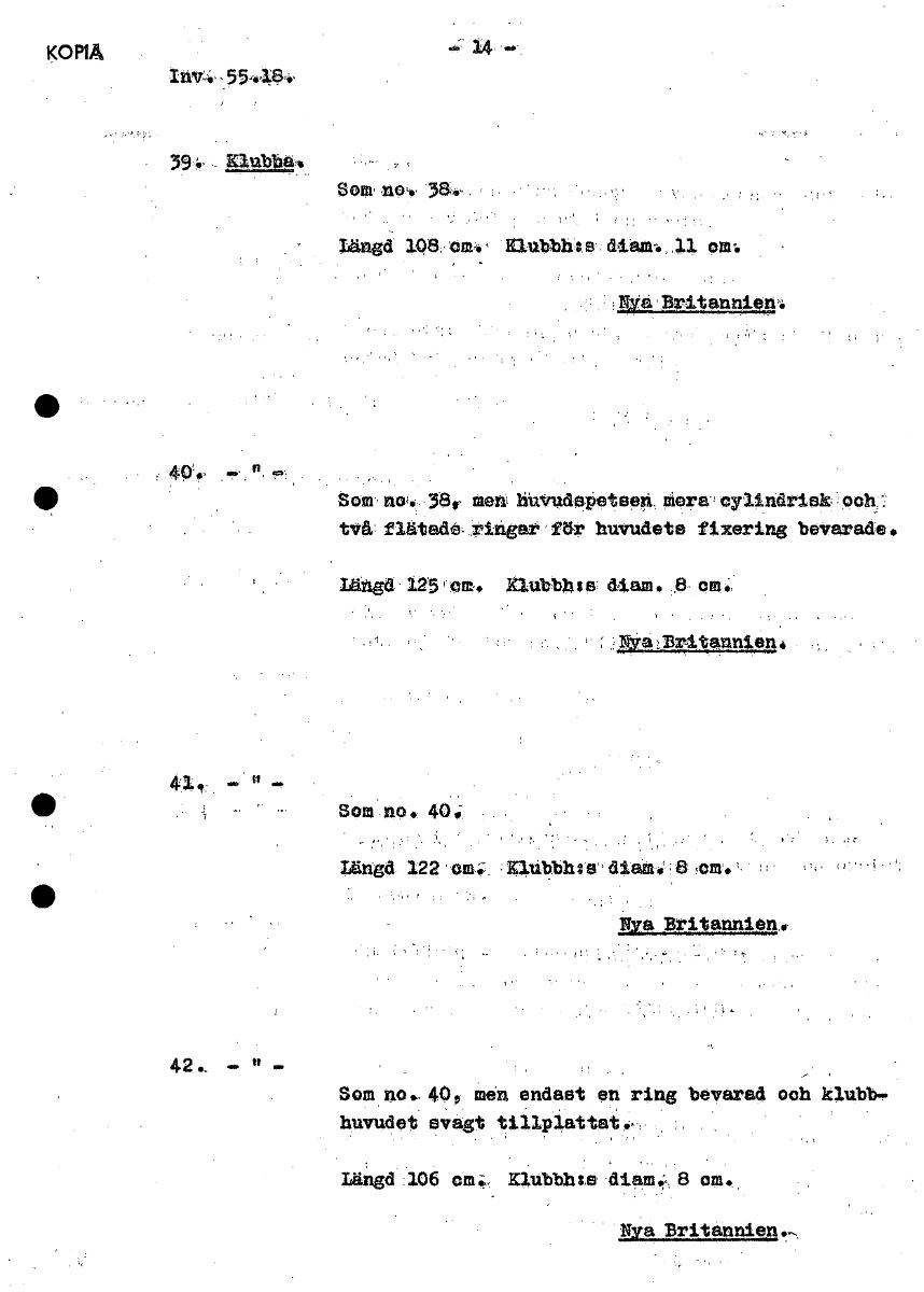 KOPIA luv55 Ow 39.: Kluba. Som, no -« 3 längd 108,cm., Klubbhie diam: 11 cm. Nya'Brita~. Som., no«..389, men huvudspetsen,, !liera, cylindrisk .och, UT& flätadk ringar 'f6r huvudets fixering bevarade. L ängd' 125 cm.. Klubbhsa diam. 8 cm. 1'4~aur3142a 41. Som no. 40. Längd 122 cm; .Klubbhget‘ dimma «, 8 ,cm. Nya Britannien. 42.. Som no. 409 men endast en ring bevarad och klubb- huvudet svagt tillplattat.› Längd :106 Klubbbis dian 4, 8 cm., Nya Britannien., [ocr]