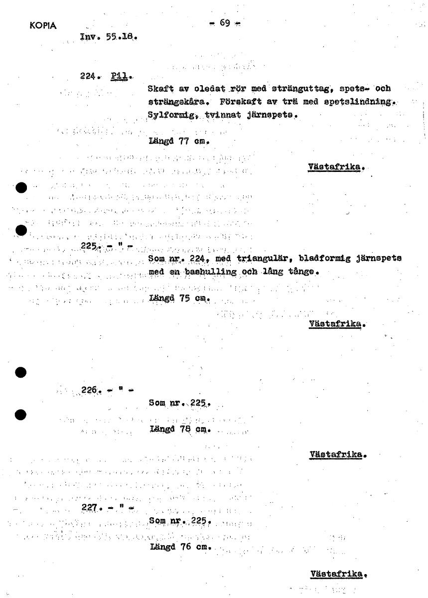 KOPIA I 04 55.18; 224. 111,4 Skaft av oledat.rOr med stränguttag, speta- och strängskåra. Pörskaft av trä med spetslindning. SYlformig9 tvinnat Järnel?"6,' Längd 77 em. Västafrika. 225,. Som ?249 med triangulär, bladformig OrnsPete med en bashUlling och lång tånge. zgng4 75 cm. Västafrik 226.. Som nr.,225. • Zängd 78 om. Västafrika. ,S0T,nT.,225. Längd 76 cm, Västafrika. [ocr]