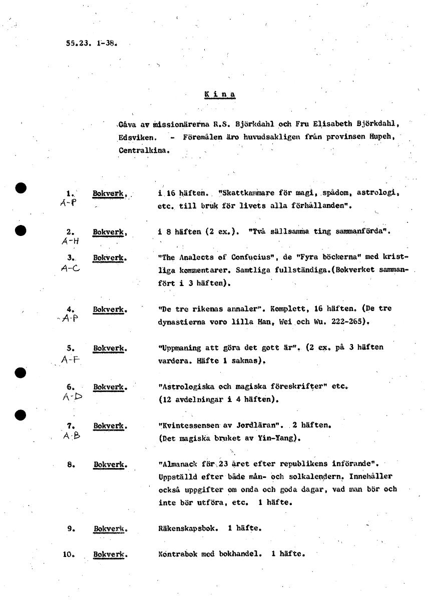 55.23. 1-38. Kina ,Gåva av missionärerna R.S. Björkdahl och Fru Elisabeth Björkdahl, Edsviken. - Föremålen äro huvudsakligen från provinsen Hupeh, Centralkina. 1., Bokverk, i 16 häften. "SkattkaMmare för magi, spådom, astrologi, etc, till bruk för livets alla förhållanden". 2. Bokverk, i 8 häften (2 ex.). "Två sällsamma ting sammanförda". • 3, Bokverk. "The Analects of Confucius", de "Fyra böckerna" med krist- liga kommentarer. Samtliga fullständiga.(Bokverket samman- fört i 3 häften). 4. Bokverk. "De tre rikenas annaler". Komplett, 16 häften. (Be tre - A-P dynastierna vore lilla Han, Wei,och Wu. 222-265), 5. Bokverk. "Uppmaning att göra det gott är", (2 ex. på 3 häften A -F vardera. Häfte 1 saknas). 6. • Bokverk. "Astrologiska och magiska föreskrifter" etc. • (12 avdelningar i 4 häften). 7. Bokverk. "Kvintessensen -av Jordläran". .2 häften. • A (Det magiska bruket av Yin-Yang). • 8. Bokverk. "Almanack för,23 aret efter republikens införande". • Uppställd efter både mån- och solkalendern. Innehåller också uppgifter om onda och goda dagar, vad man bör och inte bör utföra, etc. 1 häfte. 9. Bokverk. Räkenskapsbok. 1 häfte. 10. Bokverk, Kontrabok med bokhandel. 1 häfte. [ocr]