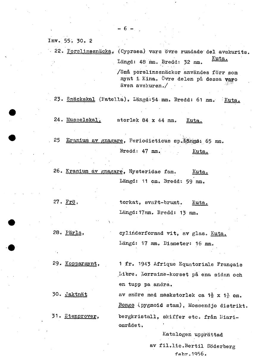Inv. 55. 30. 2 22. Porslinssnäcka, (Cypraea) vars övre rundade' del avskurits. Kuta. Längd: 48 Mm. Bredd: 32 mm. /Små porslinssnäckor användes förr som mynt i. Kina, övre delen på dessa yaro även avskuren./ - 23. Snäckekal (Patella) 9 Land 54 mm. Bredd: 61 mm. Kuta. 24. Musselskal storlek 84 x 44 mm. Kuta. 25 Kranium av gnagare, Periodicticus sp.6540.; 65 mm. Bredd: 47 mm. Kuta. 26. IlugganjurauälA, Hysteridae fara. Kuta. Längd: 11 cm. Bredd: 59 mm 27. Frö, torkat, svatt-brunt. Kuta. Längd:17mm. Bredd: 13 mm. • 28. Pärla, cylinderformad vit, av glas. Kuta. Längd: 17 mm. Diameter: 16 mm. • 29. Kopparmynt, 1 fr. 1943 Afrique Dquatoriale Fran9ais ,Libre. Lorraine-korset på ena sidan och en tupp pa andra, 30. Jaktnät av snöre med maskstorlek ca 1.1- x cm. äsalg2 (pygmold stam), Mossendjo distrikt. 31. Stenprover, bergkristall, skiffer etc. från piari- området. Katalogen upprättad av fil.lic.Bertil Söderberg febr-1(356. [ocr]