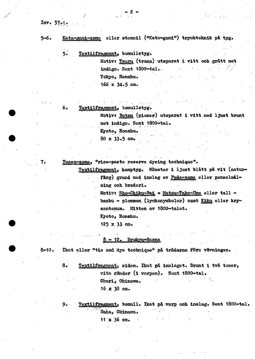 triv 5 ateggiuk" eller stencil ta gamig) tryckteknik p& tyg. Textilfrayment, bomullstyg. Motivs 'Ypura, (trene)AltoPara i vitt ooh grått mot , indigo. -Sent 1800,4a14, Tökyoo Ronshadi 166 x.3495 omo 6. 120mU1lstyg. Motivs. Botan (pioner) utsparat 1 vitt med ljust brunt mot 4.m4.14.09 Sent 1800-441. otop, Bon.shu 80 x 33.5 cm. Tusen- lomes'Irioe-opaste reserve dyeing teohnique". Taxtigrannent, hanptyg. Mönster i 'just biätt på vit (natur- färg) grund med inslag av yimagome eller penselmål- _ flins ooh broderi. ObtitS ~»~t4i Matsu-./rakeoothe eller tall bambu » plommon.(lyokosymboler) eamt 51hueller kr. santemum. Mitten av 1800-4alet. Kyoto, Honbus 3 og. 8 t0 tkat eller tio anaftys teohn4.00 p4 träda rna Ors vävningen. TextgOrafmen% siden* Ikat på inslaget* »runt i två toner,. vita- Ondet(1 varpen). Sent 1800-tal. Sisun, Okinawa. 16 å 38 om. Textiltragmentip bomull Nat, Pk varp och inslag. Sent 1800-stal. nailat'Okinawa. 11 'x 36 om. [ocr]