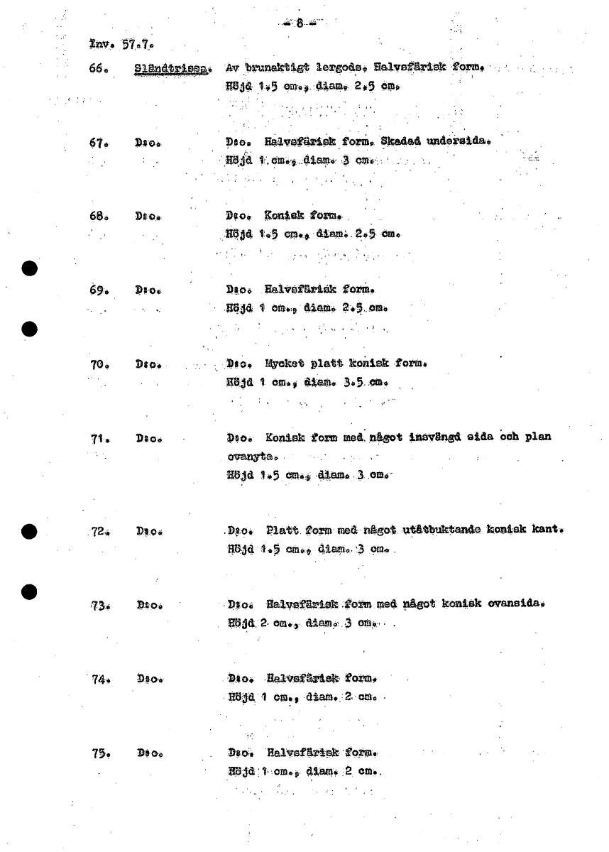 blv,0 5744 66. brunaktigt lenods. Ealvsglarisk 0441 145 911.9.44.ar4. 2.5 do. 67. No. Deo. HalvegariSk gorå. Skadal undersida. 31,54d 1rcm.1-k„diam.-3 cm.... 65. Po9:e 11;ve otsk form. „Ios *4 0R44, • 0400:4-. -24H- • 69, D:o. Dgo. BalVsgariaik form. 44 1 cm.:0 diamp 24cm. • 70. Dgo. »4C. Mycket platt konisk form. 015.,ffil I cm.# 04SO4 3.5.,emo 71. Do. Deow Konisk form med: något insangd sida 'och plan ovanyta. B63d 1.5 cm. 8.iarn. 3 .ozno- • 724 »1! ,I>go. platt gorm med nkot utdOuktan e konisk kant. 14 1. c1n.1? diam., '3 • nao. Pg00 galvegar, k :gom med t konisk «anal 3d; 2. diEun.: ota.,. 74. No. 'tio. 14/1,013ga:risk gorm. • 1113jd 1 mot diam,. 2, cm. 75. DO- Dgo; ne,Ivegarisk'go.114*- diam*, :2 om.. [ocr]