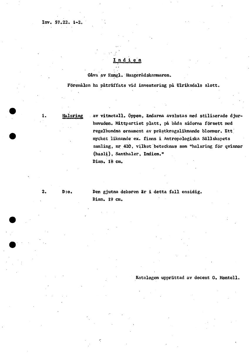 Inv. 57.22. 1-2. i e n Gåva av Kungl. Husgerådskammaren. Föremålen ha påträffats vid inventering på Ulriksdals slott. 1. Halsring . av vitmetall. Öppen, ändarna avslutas med stiliserade djur- huvuden. Mittpartiet platt, på båda sidorna försett med regelbundna ornament av prästkragsliknande blommor. Ett[ mycket.liknande'ex. finns i Antropologiska Sällskapets swnling,.nr.424, vilketbetecknas som "halsring för qvinnor (hasli), Santhaler, Indien." Diam. 18 cm. 2. D:o. Den gjutna dekoren år i detta fall ensidig. Diam. 19 cm. Katalogen upprättad av docent G. Montell. [ocr]Stäng