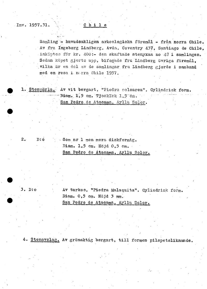 Inv. 1957 31. Chile Samling huvudsakligen arkeologiska föremål 4 från norra Chile. Av fru fngeborg Lindberg, Avda, Coventry 437, Santiago de Chile, inkUlotes för kr. 400:- den skaftade etenyxan no 47 i samlingen. Sedan köpet gjorts tapp, bifogade fru Lindberg övriga förem41, vilka är en del av de samlingar fru Lindberg gjorde 1 samband med en resa i. nd,rra Chile 1957. 1. Sterr)ärla.- Av vit bergart, "Piedraeglearea". Cylindrisk form. Piam. 1,5 cm. Tjocklek 1,5-öm. San Pedro de Ataeama A:111- Solor. 2. , Som nr 1 men mera diskformig. Diam. 1,5 em. Höjd 0,5 em. San Pedro do Ataoama. Ay114 Solor. 3 . D:o Av turkos, "Piedra Malaquita". Cylindrisk form. Diam. 0,5 em. Höjd 3 mm. San Pedro de Ataeama. 1121.11212U.D.L 4. StenalLe3u51. Av grönaktig bergart, till formen pilsPetsliknande. [ocr]