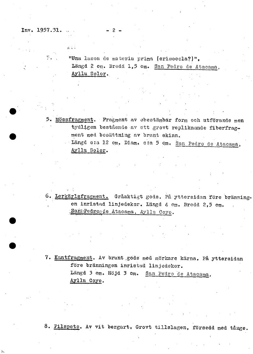 Inv. 1957.'31. "Una lasca de materia prima (erisooela?)", Längd 2 om. Bredd 1,5 cm. San Pedro de Atacama, 4Z11.1 —14.12r, 5. nultgalent. Fragment av obestämbar form och utförande men tydligen beståendeav ett grovt repliknande fiberfrag. • ment med besättning av brunt skinn. Längd c:a 12 cm. Diam. c:a 5 ep. San Pedro de Atacama .21112—ä2126 6. Lorkärlåttaglunt1 Gråaktigt godS. „På yttersidan före bränning- On inristad linjedekor. Längd 4 om. Bredd 2,5 Cm, :_planledwpcae Atacama, 4711u Coyo. • 7. Kantfragment. Av brunt gods med mörkare kärna. På yttersidan före bränningen inristad linjedekor. Längd 3 em. Höjd 3 cm. San Pedro de Atacama, AYllu Ooyo. 8. Pilspets. Av vit bergart. Grovt tidslagen, försedd med tånge. [ocr]