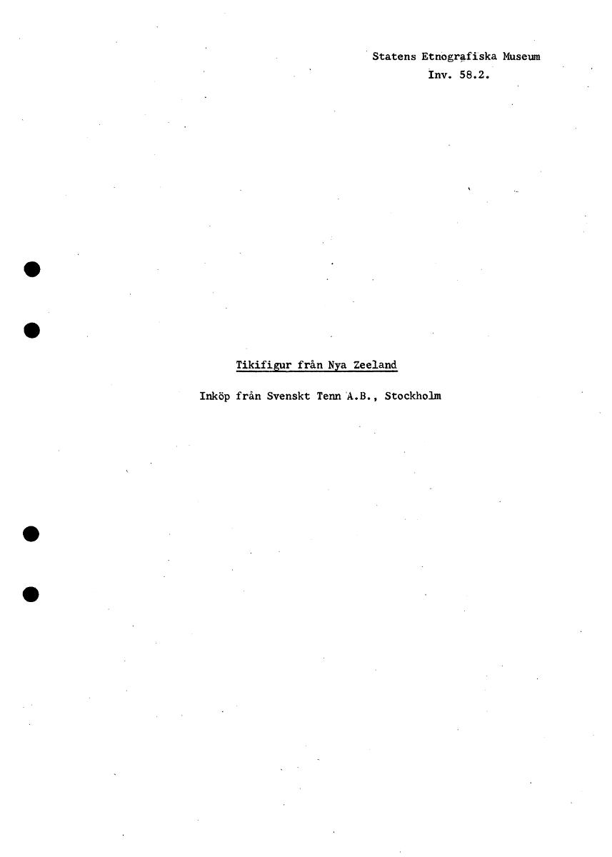 • Statens Etnografiska Museum Inv. 58.2. • • Tikifigur från Nya Zeeland Inköp från Svenskt Tenn A.B., Stockholm • • [ocr]