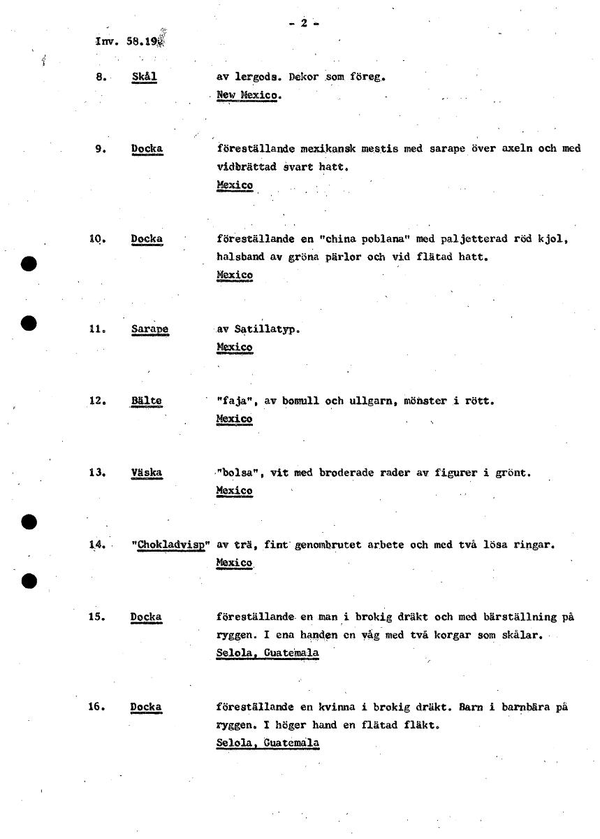 Inv. 58.19k 8. Skål av lergods. Dekor som föreg. . New Mexico. 9. Domcka föreställande mexikansk mestis med sarape över axeln och med vidbrättad svart hatt. Mexico Docka föreställande en "china poblana" med paljetterad röd kjol, halsband av gröna pärlor och vid flätad hatt. Mexico 11. Sarape av Satillatyp. Mexico 12. Bälte "faja", av bomull och ullgarn, mönster i rött. Mexico 13. Väska "bolsa", vit med broderade rader av figurer i grönt. Mexico 14. "Chokladvisp" av trä, fint genombrutet arbete och med två lösa ringar. Mexico_ 15. Docka föreställande en man i brokig dräkt och med bärställning på ryggen. 1 ena handen en våg med två korgar som skålar. Selola, Guatemala 16. Docka föreställande en kvinna i brokig dräkt. Barn i barnbära på ryggen. 1 höger hand en flätad fläkt. Selola, Guatemala [ocr]Stäng