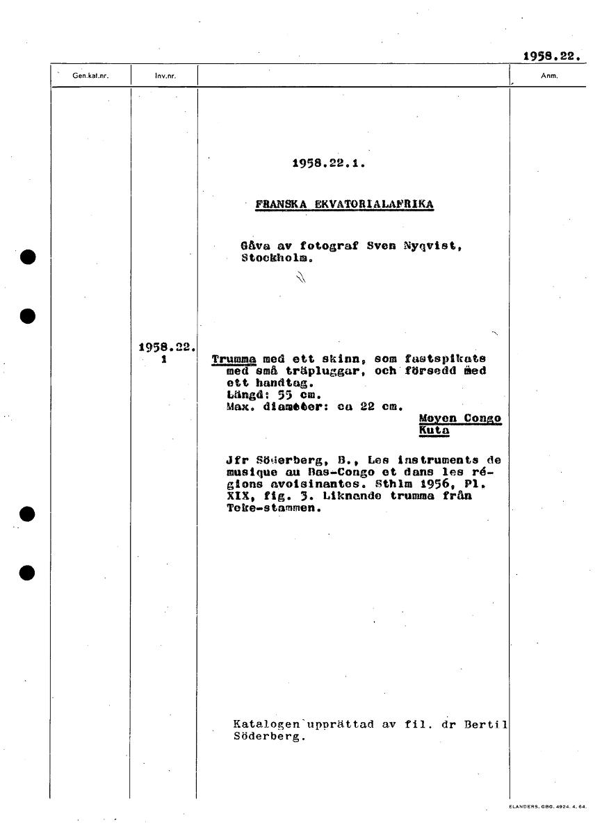 1958.22. 1958.22.1. • FRANSKA OKVATORIALAFRIKA Gåva av fotograf Sven Nyqvist, Stockholm.. • 1958.22. 1 Trumma med ett skinn, som fastspikats med sm& träpluggar, och -försedd råed ett handtag. Längd: 5...