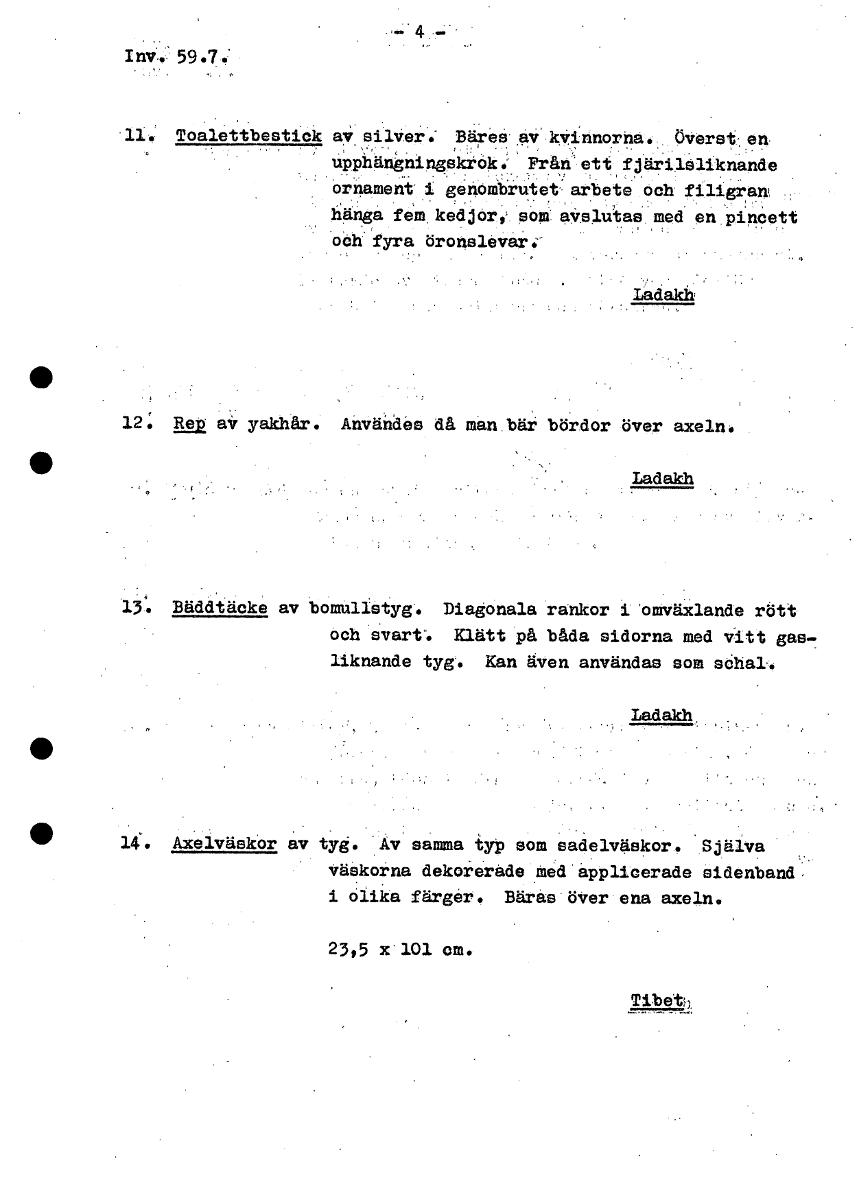 Iv.: 59.7.; 11. Toalettbestick av silver: Bäres av' keinnorna. översten. 1113Phänningsktok. Frådett,fjärilsliknande ornament i genombrutet arbete och filigran' , , . hänga fem kedjor, som avslutas med en pincett och' fyra öronslevar: Ladakh 12. änav yakhAr. Användes då man bär bördor över axeln. Ladakh 13. Bäddtäcke av bomullstyg. Diagonala rankor i 'omväxlande rött och svart. Klätt på båda sidorna med vitt gas- liknande tyg. Kan även användas som schal. Ladakh, - - 010 14. Axelväskor av tyg. Av samma typ som sadelväskor. Själva väskorna dekorerade med applicerade sidenband,' i Olika färger. Bäras över ena axeln. 23,5 x101 cm: Tibet) [ocr]