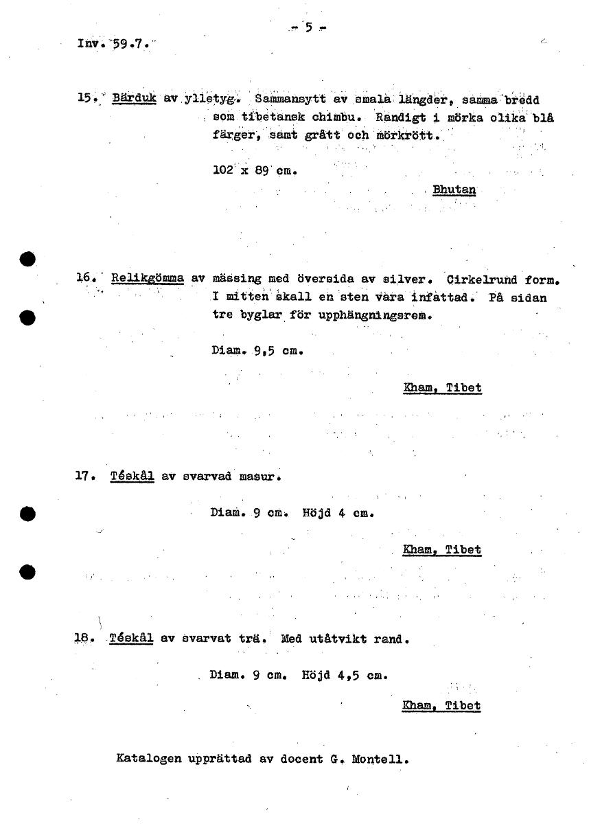 Inv. 59.7. Bäduk-av,yiletyg,:, Sammansytt av etalaiängdettsaitma btedd som. tibetansk chimbu. Randigt i mörka olika blå färget;ååmt grått och mörkrött.. 102' X 89 cm• Bhutan 16. Relikgömma av mässing med översida av silver. Cirkelrund form. 1 mitten skall en sten vara infattad. På sidan • tre byglar, för upphängningsrem. Diam. 9,5 cm. Kham, Tibet 17. Tdskål av svarvad masur. Ditut. 9 cm. Höjd 4 cm. Kbm, Tibet • -Tdskål av svarvat trä. Med utåtvikt rand. Diam. 9 cm. Höjd 4,5 cm. am, Tibet Katalogen upprättad av docent G. Montell. [ocr]