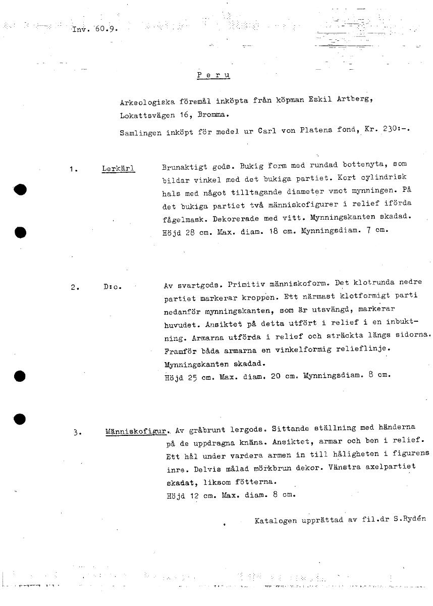 InV. Peru Arkeologiska föremål inköpta från köpman Eskil. Artberg, Lokattsvägen 16, Bromma. Samlingen inköpt för medel ur Carl von Platens fond Kr. 230:-. 1. Lerkärl Brunaktigt gods. Bukig form med ru...