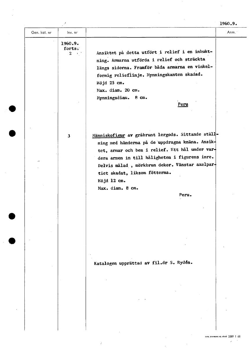 1960.9. 1960.9. fort&. 2 Ansiktet på detta utfört i relief i en inbukt- ning. Armarna utförda i relief och sträckta längs sidorna. Framför båda armarna en vinkel- formig relieflinje. Mynningskanten skadad. Höjd 25 cm. Max. diam. 20 cm. Mynningsdian. 8 cm. Peru • 3 Människofigur av gråbrunt lergods. Sittande stäl ning med händerna på de-uppdragna knäna. Ansik tet, armar och ben i relief. Ett hål under var dera armen in till håligheten i figurens inre. Delvis målad , mörkbrun dekor. Vänstar axelpar tiet skadat, liksom fötterna. Höjd 12 cm. Max. diam. 8 cm. Peru. • Katalogen upprättad av fil.dr S. Rydén. [ocr]Stäng