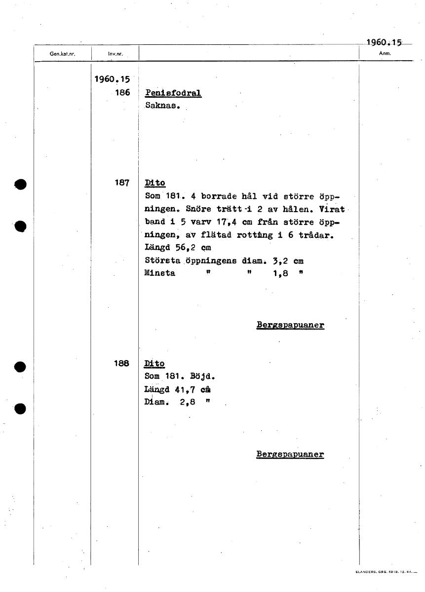 1960.15 1960.15 186 Penisfodral Saknas. • 187 Dito Som 181, 4 borrade hål vid större öpp- ningen. Snöre trättd 2 av hålen. Virat- . band i 5 varv 17,4 cm från större öpp- ningen, av flätad rottung i 6...